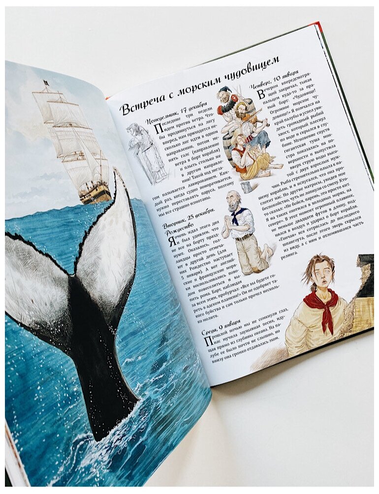 Замечательная книга! В меру увлекательная и познавательная. Содержание похоже на дневники Робинзона Крузо, если бы герой был ребенком и первый раз вышел в море, повстречав пиратов и много кого еще. Для погружения в эпоху и развлечения книга отлично подходит. В ней много иллюстраций и кратких заметок под ними, объясняющих, к примеру, что такое такелаж или румб. Следя за записями в дневнике мальчика и рассматривая картинки, можно научиться стрелять ядрами из пушки, узнать, как определять положение корабля в море, и направление курса. Сама книга довольно большого формата, в твердой обложке, и страницами из мелованной бумаги - сохранится надолго. На мой взгляд, книга будет интересная детям лет с семи и старше, ну или можно младше, но только если они очень любят пиратскую тему.