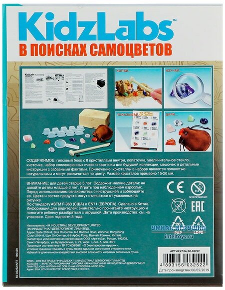 | Комплектация | гипсовый блок с 8 кристаллами внутри, лопаточка, увеличительное стекло, кисточка, набор ячеек и карточки, мешочек, инструкция |