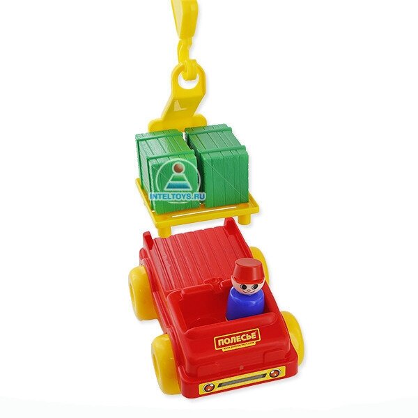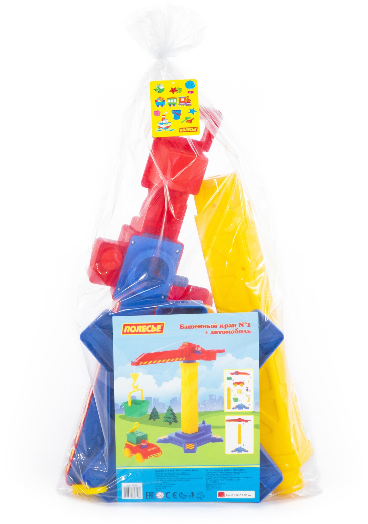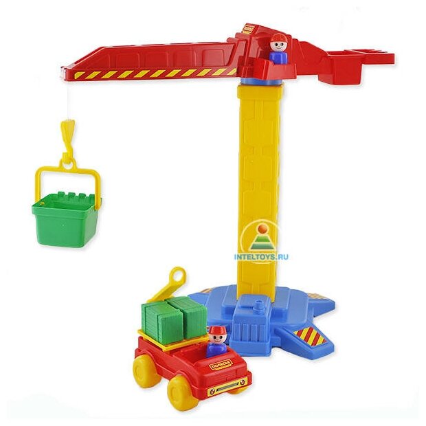 Любителям спецтехники обязательно придётся по вкусу Башенный кран №1 от компании «Полесье». Кран оснащён подъёмным механизмом. Стрела вращается вокруг своей оси. В наборе с краном идёт корзина для транспортировки груза, а также автомобиль с улыбчивыми строителями за рулём. Для того, чтобы игра была более реалистичной набор дополнен ящиками, имитирующими груз.