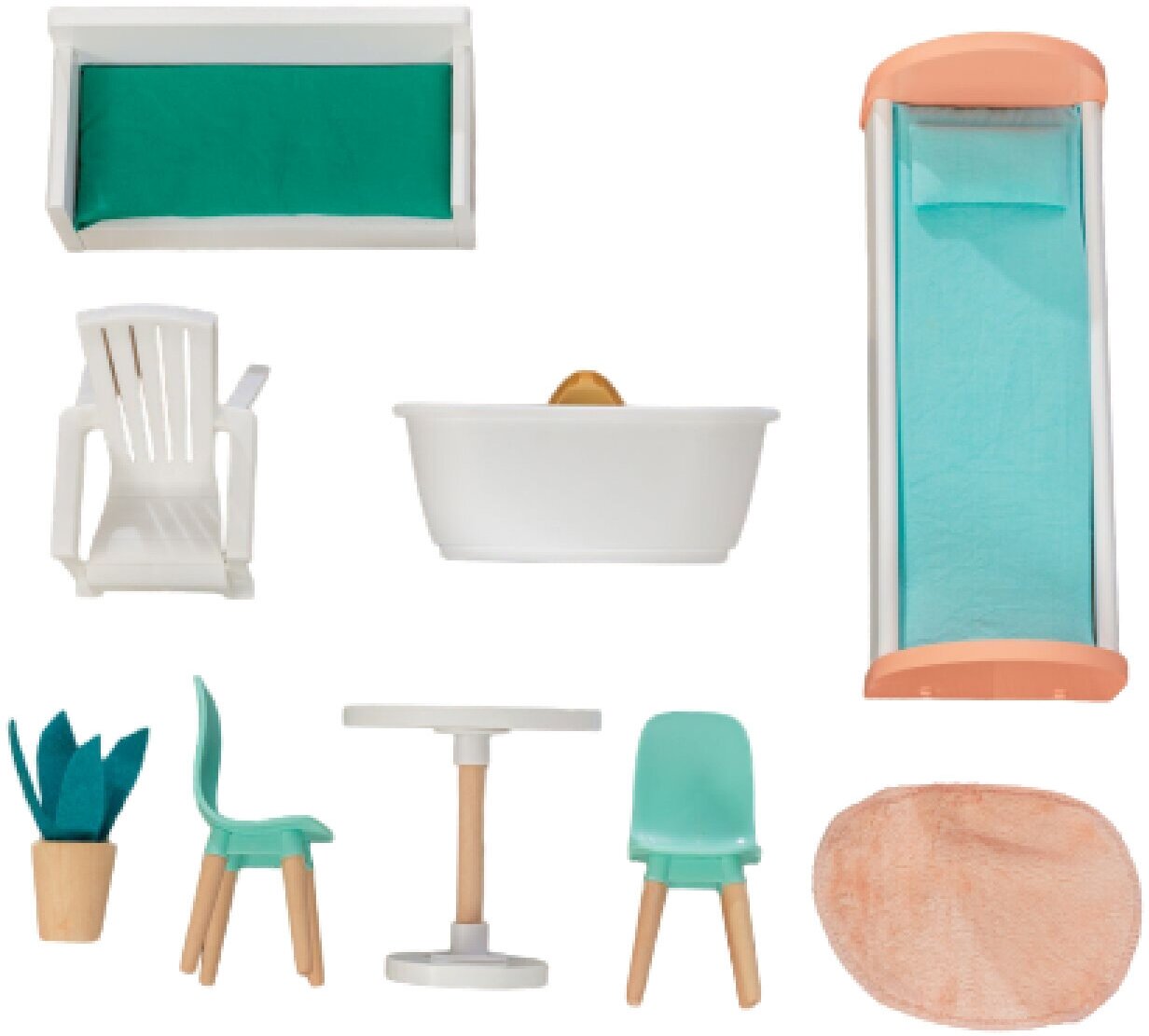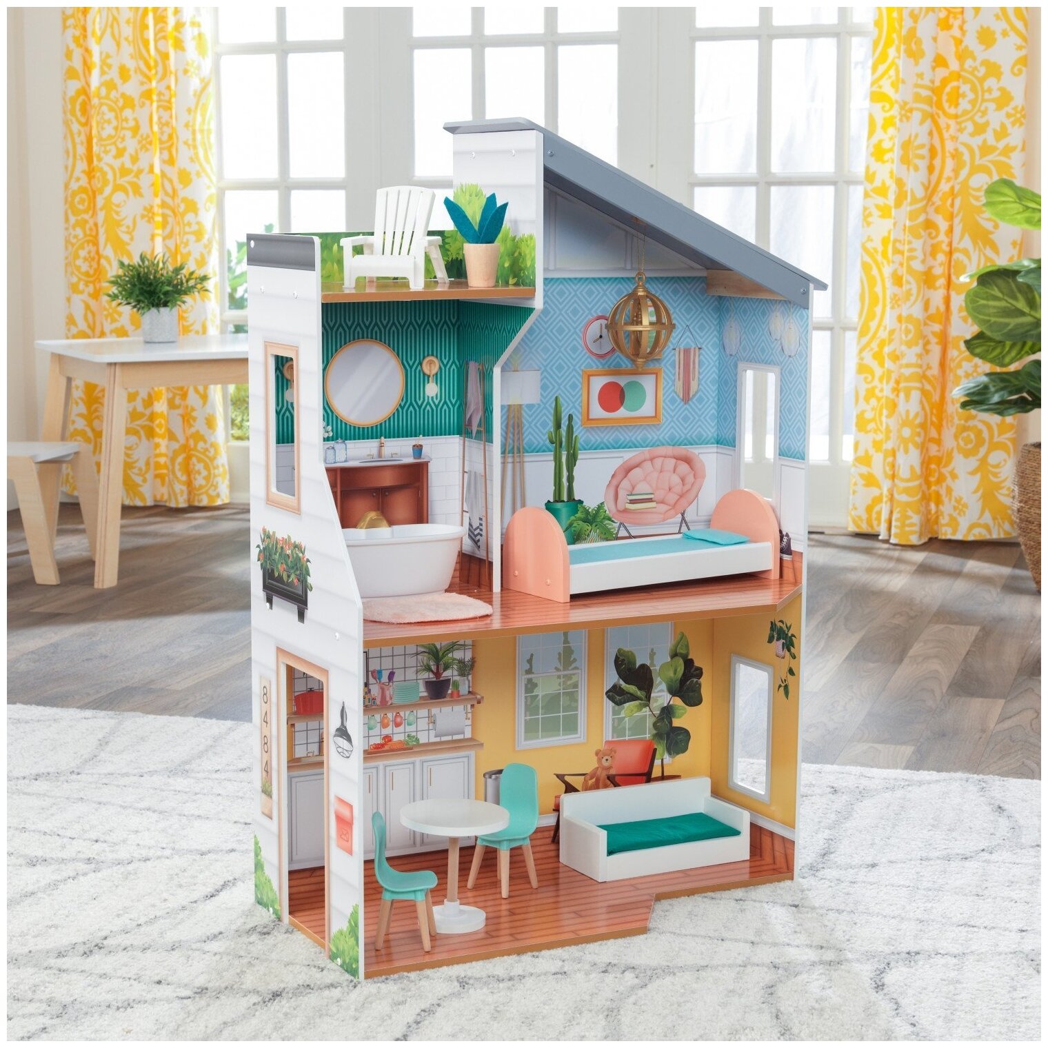 Кукольный домик Эмили наполнен солнечными цветами, современной мебелью и просторными окнами и дверями. Угловая линия крыши над спальней с причудливой металлической люстрой, идеально подходядит для гламурного уединения кукол. Внутренний дворик на крыше идеально подходит для того, чтобы посидеть на улице и погреться на солнце. Небольшой размер кукольного домика идеально подходит для небольших пространств, но при этом предлагая огромное количество игры и веселья. Кукольный дом имеет 4 уровня для разнообразной и увлекательной игры. Задняя стенка дома глухая, а лицевая часть полностью открыта, позволяя ребёнку играть в нём. Внутри расположено 3 комнаты и патио на 3 этаже. На 1-м этаже находится кухня-столовая, на 2-м этаже расположена спальня и ванная, на 3-м – патио. Чтобы придать уникальность интерьеру каждой комнаты, на деревянные стены нанесены красочные рисунки с изображением мебели, окон, штор и т. д. В комплекте предусмотрена мебель, которой можно обставить комнаты на свой вкус - стол, 2 стула, кровать, диван, ванна, люстра, шезлонг, цветочный горшок, коврик, в позволяющих расширить возможности игры. Внимание! Куклы в комплект не входят и приобретаются отдельно!
