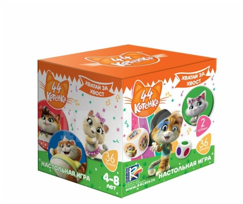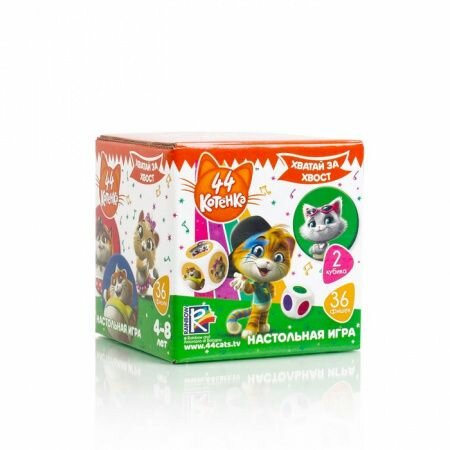 Vladi Toys Игра настольная 44 Котенка Хватай за хвост Будь самым внимательным и ловким! Схвати пушистого за хвост быстрее всех! На поле раскладываем фишки с котятами лицевой стороной вверх. Подбрасываем поочередно оба кубика. Сначала с изображением цвета, а затем – персонажа. Ищем нужную нам фишку, соответствующую комбинации на кубиках. Например, красный и Пилу. Кто найдет первым – хватает скорее себе! Победит тот, кто соберет больше фишек! Игра развивает внимательность, логическое мышление, скорость реакции и коммуникативные навыки.