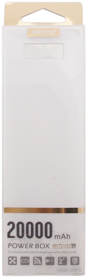 Это внешний аккумулятор высокой емкости, полезность которого сложно переоценить в ежедневном использовании. Способен заряжать смартфон, планшет и много других устройств в любом месте и в любое время. Высокую базовую емкость оценят все, кому приходится часто быть вдали от розетки, ведь гарантируется поистине долгое время автономной работы. Встроенная система защиты надежно сохранит все компоненты от повреждения. Портативное зарядное устройство Remax Proda Series 20000mAh PPL-12 white продливает срок работы вашего устройства в дальней дороге, поездке на природу, в путешествии и любой другой ситуации, когда вам необходимо оставаться на связи или поддерживать долгую работу устройства, а возможности произвести зарядку от сети нет.