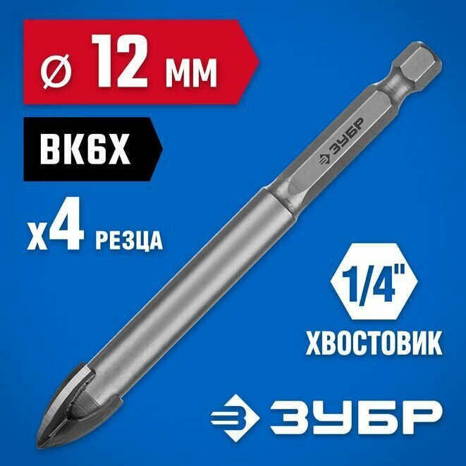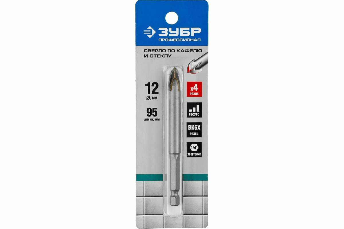 Сверло по стеклу и кафелю Зубр Ø 12 мм, HSS-R, быстрорежущая сталь М2(S6-5-2) Р6М5, класс А 4-х резцовый, длина 95 мм, HSS-R, быстрорежущая сталь М2(S6-5-2) Р6М5, класс А шестигранный хвостовик,