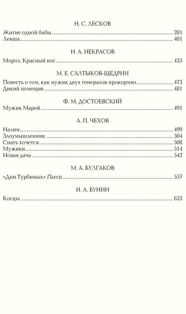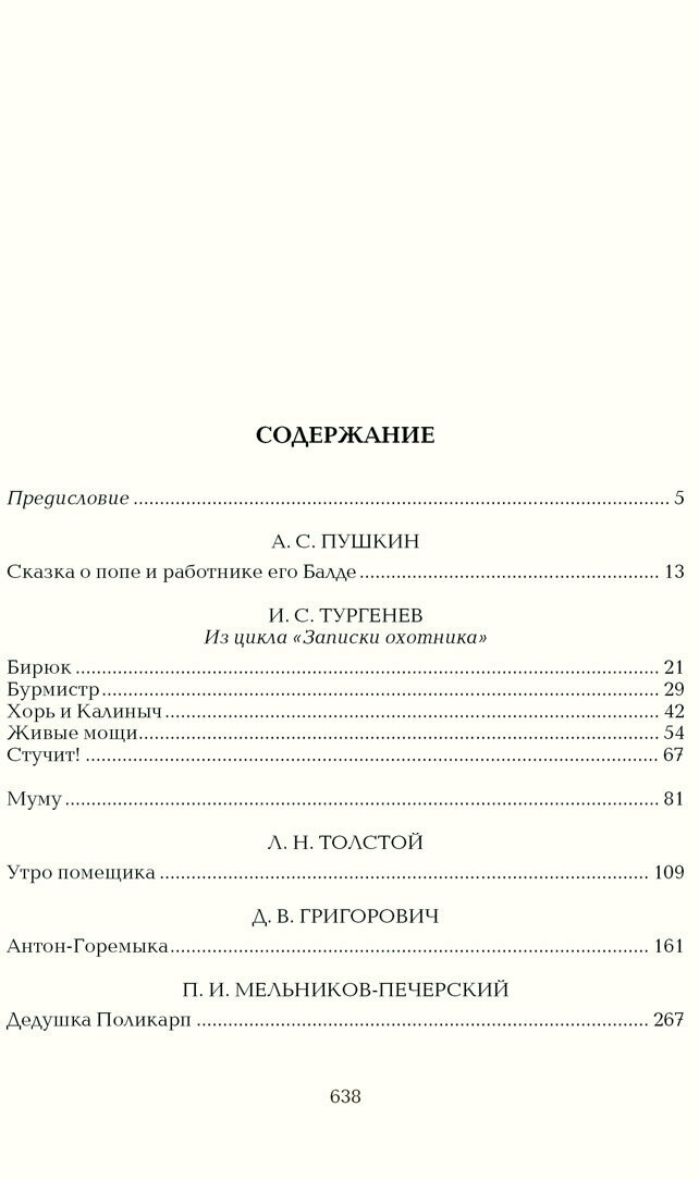 .В сборник вошли произведения русских писателей: А. Пушкина, И. Тургенева, JI. Толстого, Д. Григоровича, П. Мельникова-Печерского, Н. Лескова, Н. Некрасова, М. Салтыкова-Щедрина, Ф. Достоевского, А. Чехова, М. Булгакова, И. Бунина.
