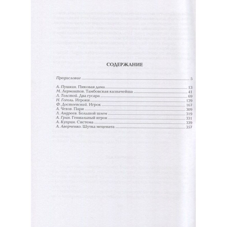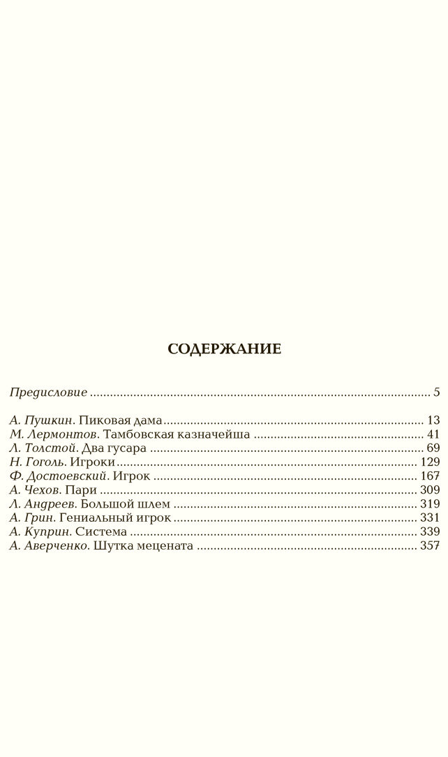 Прекрасно изданная книга. Приятно взять в руки и предаться чтению. В книге представлены десять всемирно известных произведений русских классиков. Все произведения описывают те или иные события, связанные с карточными играми, азартными играми, граничащими с переходом в зависимость от игромании. Эти произведения написаны авторами, которые сами прошли через испытания сильных переживаний, связанных с азартной игрой. Тем интереснее читать и сравнивать отношение к Игре столь разных и уважаемых авторов.