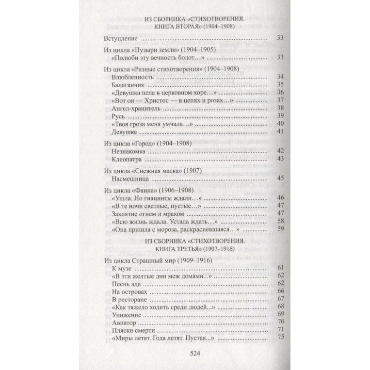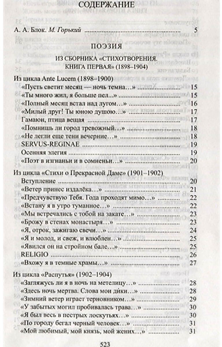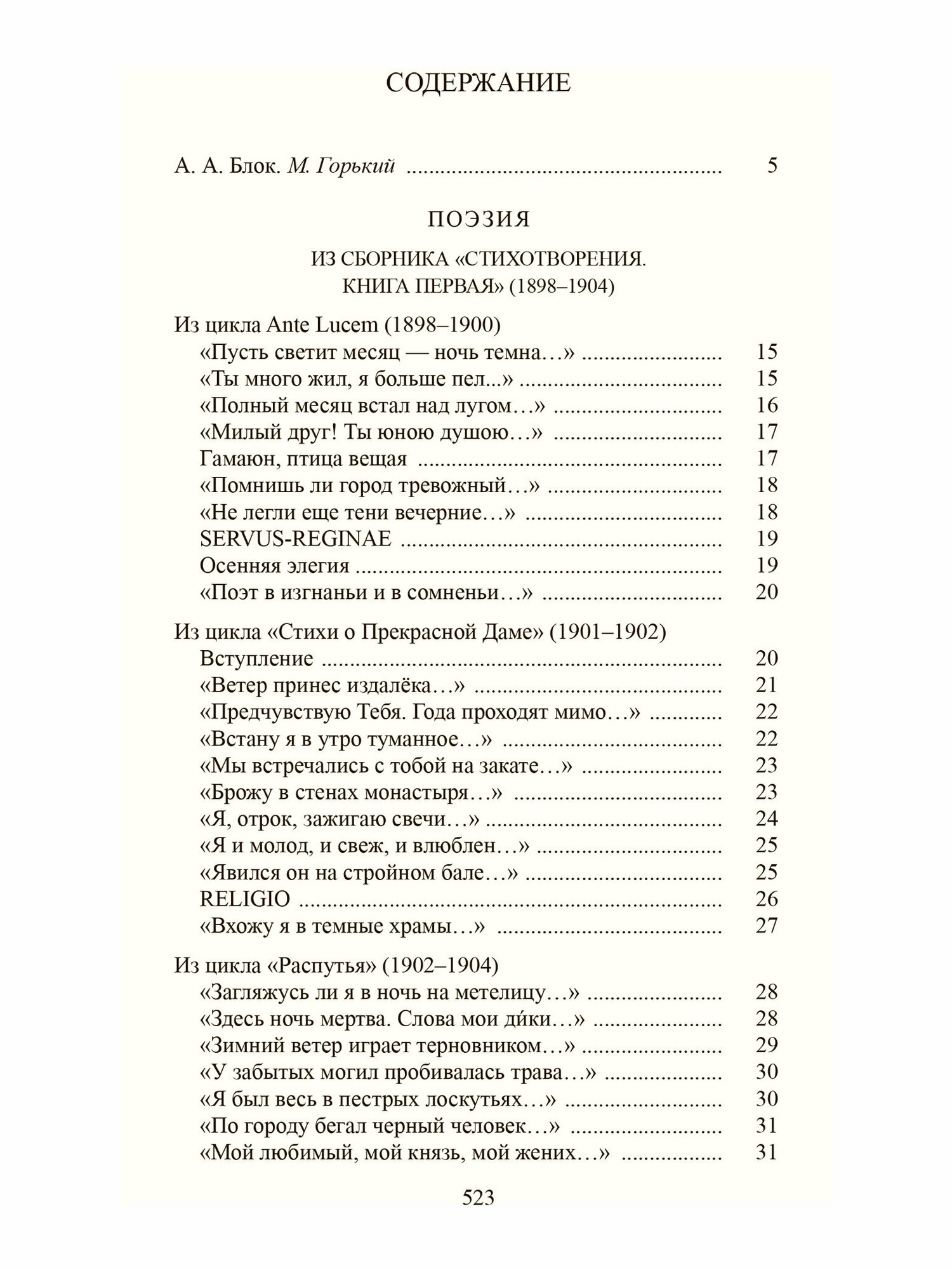 .В книгу вошли избранные стихотворения из циклов «Ante Lucem»,| «Стихи о Прекрасной Даме», «Распутья», «Пузыри земли», «Разные стихотворения», «Город», «Снежная маска», «Фаина», «Страшный мир», «Возмездие», «Ямбы», «Арфы и скрипки», «Кармен», «Родина»; поэмы «Соловьиный сад», «Возмездие», «Двенадцать», «Скифы» и прозаические произведения: «Исповедь язычника», «Девушка розовой калитки и муравьиный царь», «Сказка о той, которая не поймет ее», «Ни сны, ни явь», а также избранные критические и публицистические статьи.