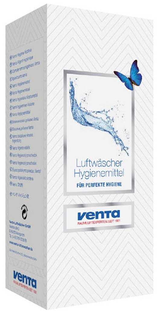 Обратите внимание - данная добавка не подходит для приборов Venta серий Professional и AeroStyle. В связи с обновлением упаковки, гигиеническая добавка поставляется как в голубых, так и в белых флаконах. описание Гигиеническая добавка создана специально для мойки воздуха VENTA. Состав гигиенической добавки VENTA включает комбинацию компонентов, которые предотвращают рост бактерий и микроорганизмов, поступающих в воду из воздуха. Поэтому накапливающаяся в воде прибора грязь в виде: пыли (пылевых клещей), пыльцы растений, шерсти и перхоти животных, текстильных волокон и т. д. не разлагается и не приводит к “цветению” воды. Составные компоненты разрабатываются и производятся на известных немецких химических предприятиях, которые специализируются в областях гигиены, обогащения и очистки воды.применение Гигиеническая добавка VENTA значительно улучшает биологическую очистку воды, добавка легко восполняется через 10-14 дней. Отработанные компоненты добавки не наносят вреда окружающей среде, поэтому отработанную воду можно без опасения сливать в канализацию. ● Водопроводная вода насыщена большим количеством солей кальция. Поэтому при эксплуатации мойки воздуха внутри прибора может образовываться кальцинированный налет. Однако гигиеническая добавка VENTA способна преобразовывать кристаллическую структуру частиц кальция, благодаря чему в приборе вместо жестких кальцинированных наростов образуется тонкая кристаллическая пленка, которая легко смывается водой. ● Гигиеническая добавка VENTA повышает эффективность работы мойки воздуха за счёт уменьшения поверхностного натяжения воды. Благодаря этому легче достигается и стабилизируется оптимальная влажность воздуха (40-60%) в помещении. ● Гигиеническая добавка VENTA удерживает из поступающего в прибор воздуха водоотталкивающие (не смачиваемые водой) частицы пыли (такие как синтетические волокна, пропитанные натуральные волокна, шерсть животных), которые иначе отскакивали бы от поверхности воды как теннисный мячик. Составляющие компоненты Гигиенической добавки VENTA уже много лет применяются для очищения плавательных бассейнов, а также в климатических установках для жилых и производственных помещений. Например, в больницах и госпиталях, врачебных практиках, старинных зданиях, детских садах и т. д. Эти компоненты применяются в качестве средств для консервирования, в лекарствах и косметике: глазные и носовые капли, дезодоранты, шампуни, кондиционеры для волос и т. д. Важное значение имеет то, что Гигиеническая добавка VENTA не испаряется, полностью оставаясь в резервуаре для воды. В течение 20-летней практики применения Гигиеническая добавка VENTA оправдала себя во многих направлениях без выявления случаев, составляющих угрозу жизни и здоровью пользователя приборов VENTA. Наоборот, многие люди, измученные аллергией на домашнюю пыль и пыльцу, используют увлажнители очистители воздуха VENTA c Гигиенической добавкой VENTA круглогодично.