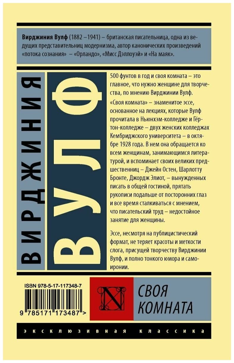 "Своя комната" - знаменитое эссе, основанное на лекциях, которые Вулф прочитала в Ньюнхэм-колледже и Гёртон-колледже - двух женских колледжах Кембриджского университета - в октябре 1928 года. В нем она обращается ко всем женщинам, занимающимся литературой, и вспоминает своих великих предшественниц - Джейн Остен, Шарлотту Бронте, Джордж Элиот, - вынужденных писать в общей гостиной, прятать рукописи подальше от посторонних глаз и все время сталкиваться с мнением, что писательский труд - недостойное занятие для женщины.