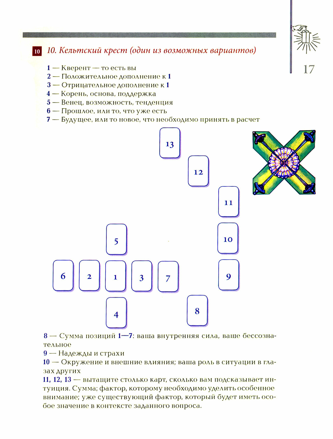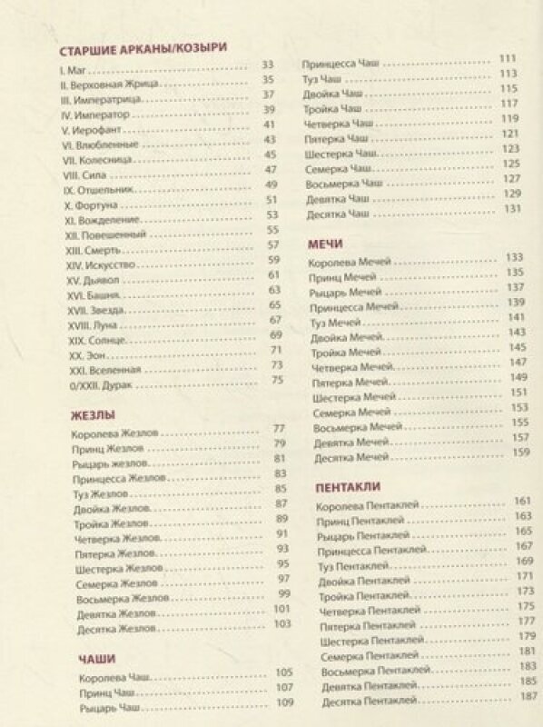 Старшие и младшие арканы очень хорошо что разбираются и описание цветов в картах, также есть несколько раскладов, хорошая книга за свои деньги. -