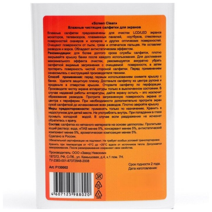 Влажные чистящие салфетки "Screen Clean" предназначены для ухода за жидкокристаллическими (LCD, LED) экранами. Салфетки обеспечат деликатную и эффективную очистку поверхности экрана Вашего монитора от пыли, грязи, отпечатков пальцев и не оставят разводов и ворса. Имеют длительный антистатический эффект, который предотвращает быстрое оседания пыли на очищаемую поверхность. Важно! Перед применением ознакомьтесь с инструкцией производителя оргтехники. Вытирайте экран в холодном (выключенном) состоянии - это исключит образование разводов. После удаления видимых загрязнений рекомендуется протереть поверхность чистой стороной салфетки или воспользоваться сухой салфеткой 'Favorit Office'.Производство FAVORITOFFICE(Россия)Вес брутто: 0,025кгТип: салфетки влажныеНазначение: для ЖК (LCD TFT) и др. экрановКол-во в упаковке: 100 шт