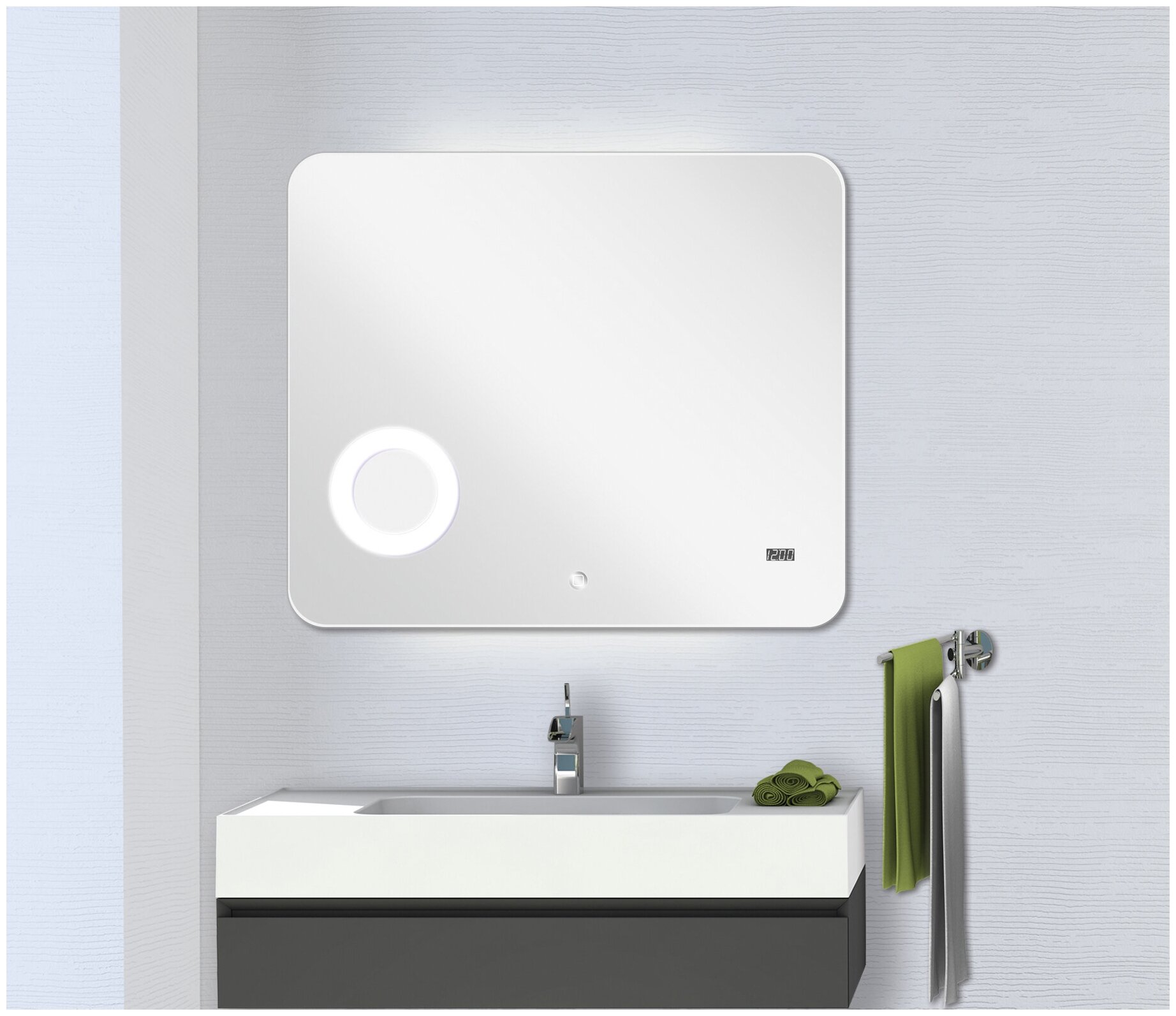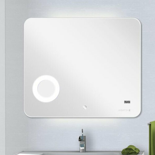 Зеркало Элио 100 с подсветкой - В изделие встроено дополнительное увеличительное косметическое зеркало, электронные часы и сенсорный выключатель, выполненном в модном и узнаваемом стиле. - Вокруг увеличительного зеркала - мощная круговая подсветка, которая не позволит оставить без внимания даже самые мелкие детали. - Зеркальное полотно покрыто специальной пленкой, которая защищает его от повреждений и попадания влаги. Кроме того, такое решение повышает безопасность изделия – при его повреждении осколки не разлетаются, а остаются на пленке. - В зеркало встроена дополнительная фоновая подсветка - светильники сверху и снизу, расположенные за зеркальным полотном.