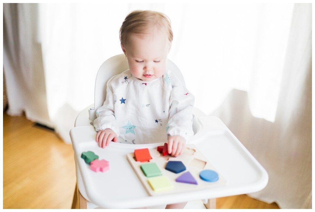 Нагрудник нравится. На мой взгляд немного коротковат, но когда малыш сидит это не так заметно. Он действительно не промокаемый, стирать поверхность нагрудника не надо, можно просто протереть. Но, соответственно, так как он гладкий снаружи. Жидкости стекают на ножки, если ничего не проложить. Поэтому когда мы кушаем суп, я придвигаю ребенка к столу между ними прокладываю салфетку и тарелку тоже вплотную к ребёнку придвигаю.