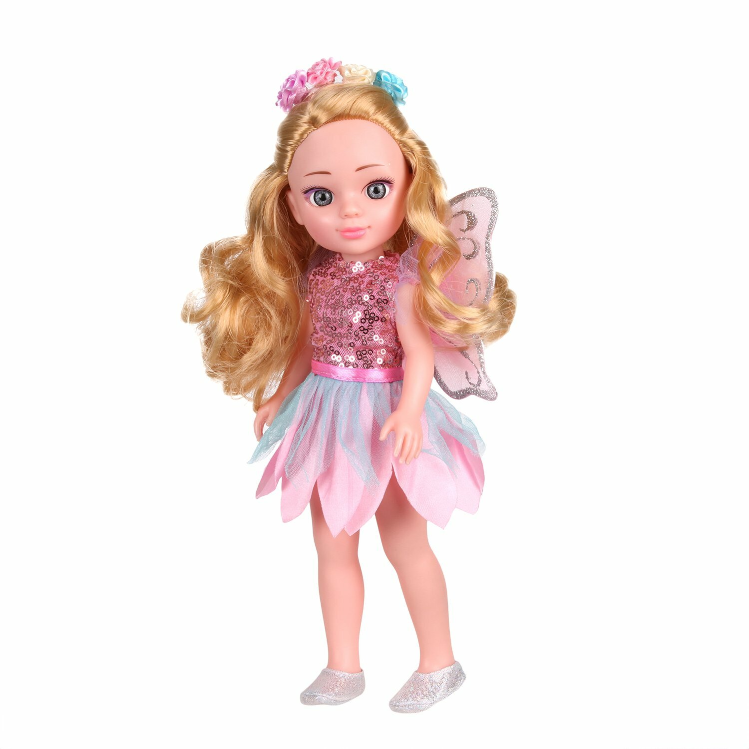 Кукла меняет наряд и преображается из принцессы цветов в прекрасную фею, которая прилетела к нам прямо из сказочной страны. Словно по волшебству у неё за спиной появляются тонкие прозрачные крылья. Чудеса, да и только!