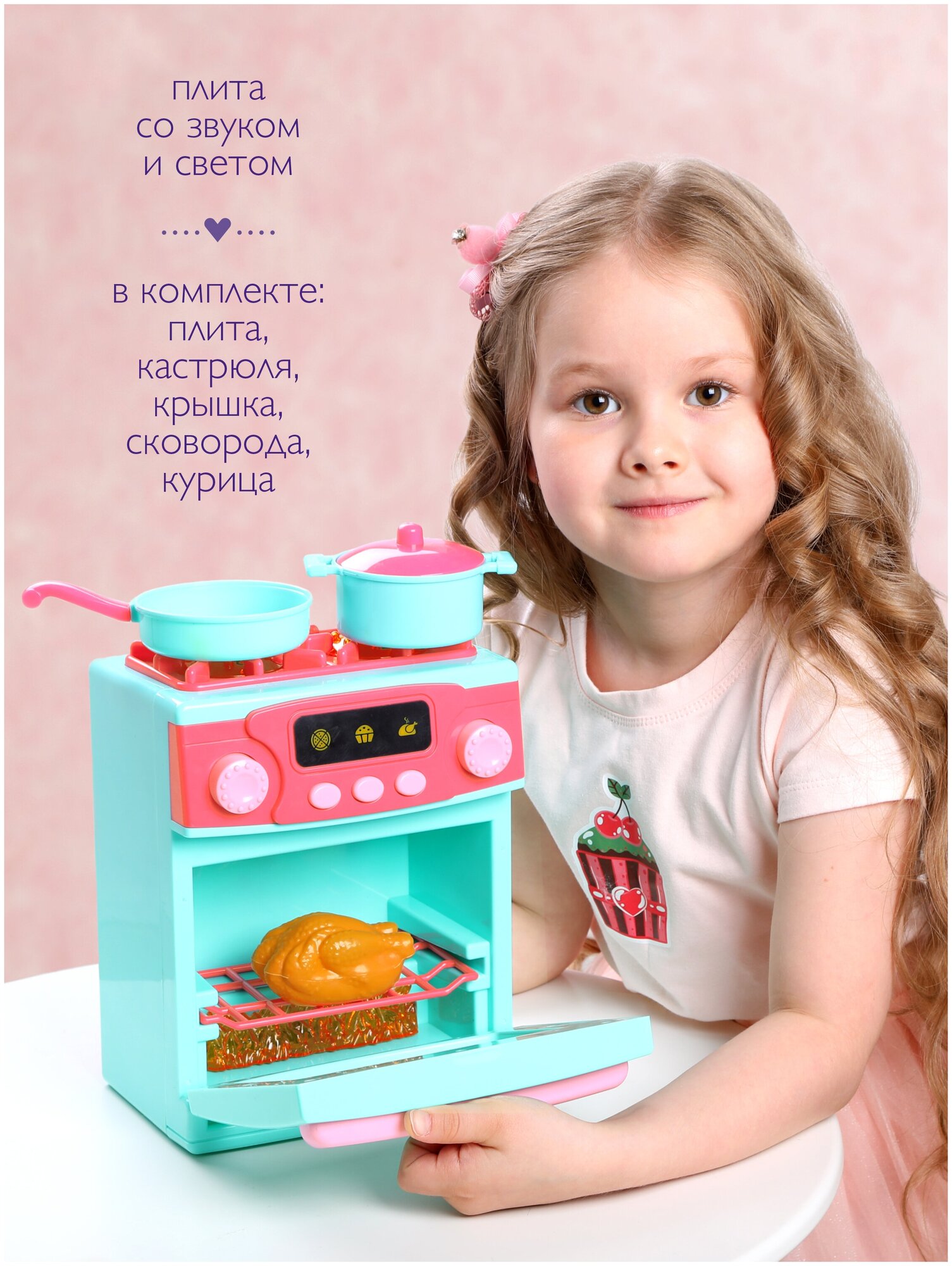 В комплекте с плитой прилагаются следующие игрушки: сковородка, кастрюля, крышка, яичница и курица.