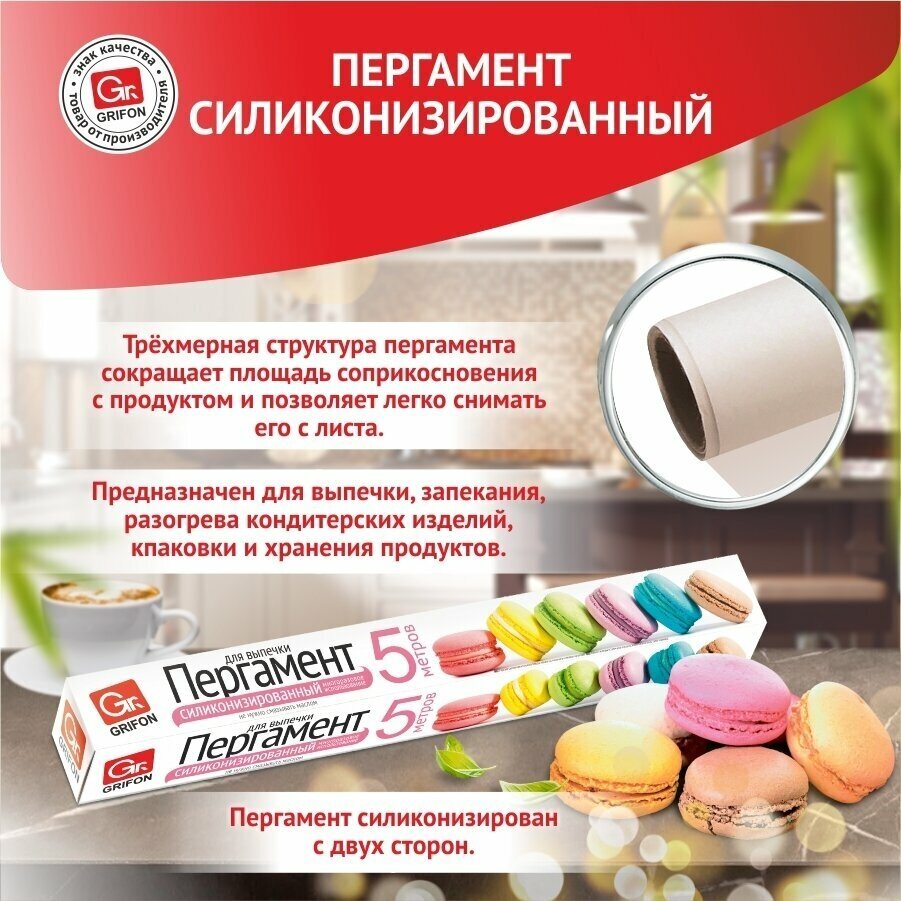 Пергамент GRIFON обладает влаго- и жиронепроницаемостью. Эти полезные качества делают его использование удобным и практичным как в домашнем хозяйстве, так и в хлебопекарном производстве. Он предназначен для выпечки, запекания, разогрева. Силиконизированный пергамент не требует промасливания. Эффективные жиро- и влагоразделительные характеристики пергамента GRIFON позволяют избежать прилипания выпечки к формам и противням, подгорания продуктов и утомительной очистки рабочих поверхностей. Максимальная температура использования пергамента GRIFON составляет +250 °С. Это оптимальный температурный режим как для электрических, так и для газовых духовых шкафов.
