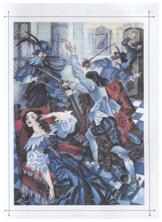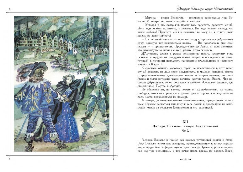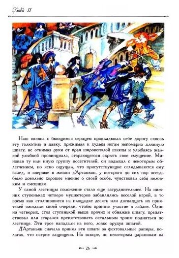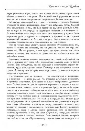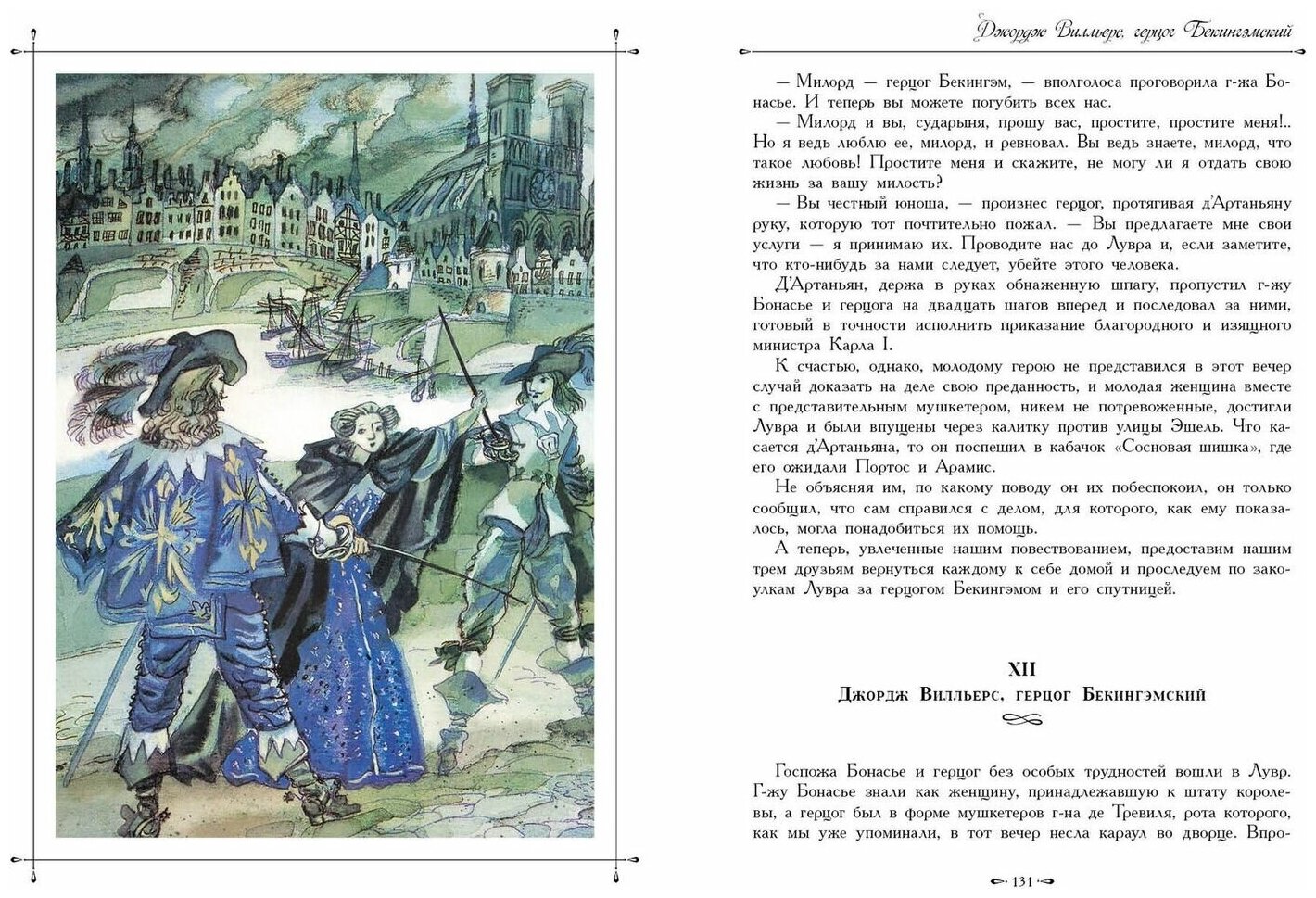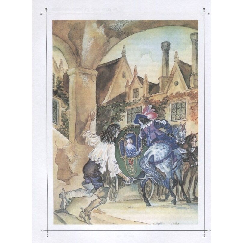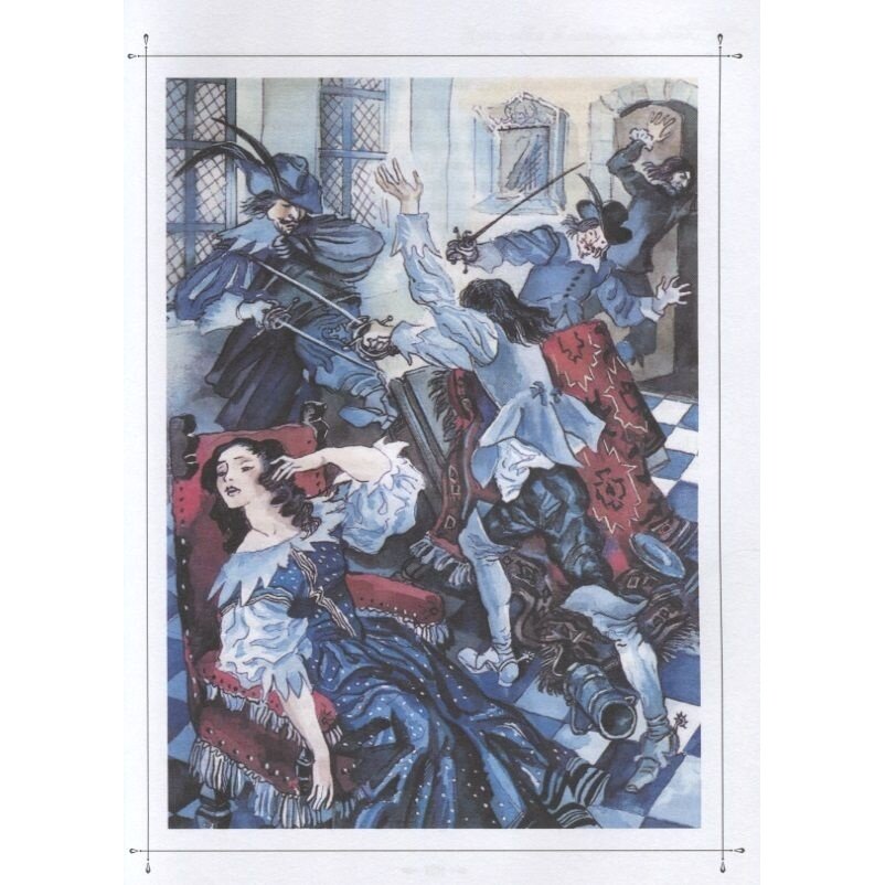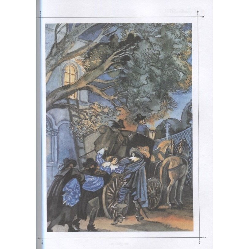 Эта самая знаменитая книга Дюма несколько напоминает картинку-загадку, на которой видишь то юную девушку, то злую старуху. Когда читаешь про мушкетеров в юности, они все представляются образцовыми героями. Когда же перечитываешь в зрелые годы, то больше заметна ирония автора, и вообще начинаешь испытывать симпатию к "отрицательным" персонажам. Интересно, насколько этот двойной эффект был сознательно задуман авторами - Дюма-отцом и Маке. В тексте встречаются цветные иллюстрации, но не часто.