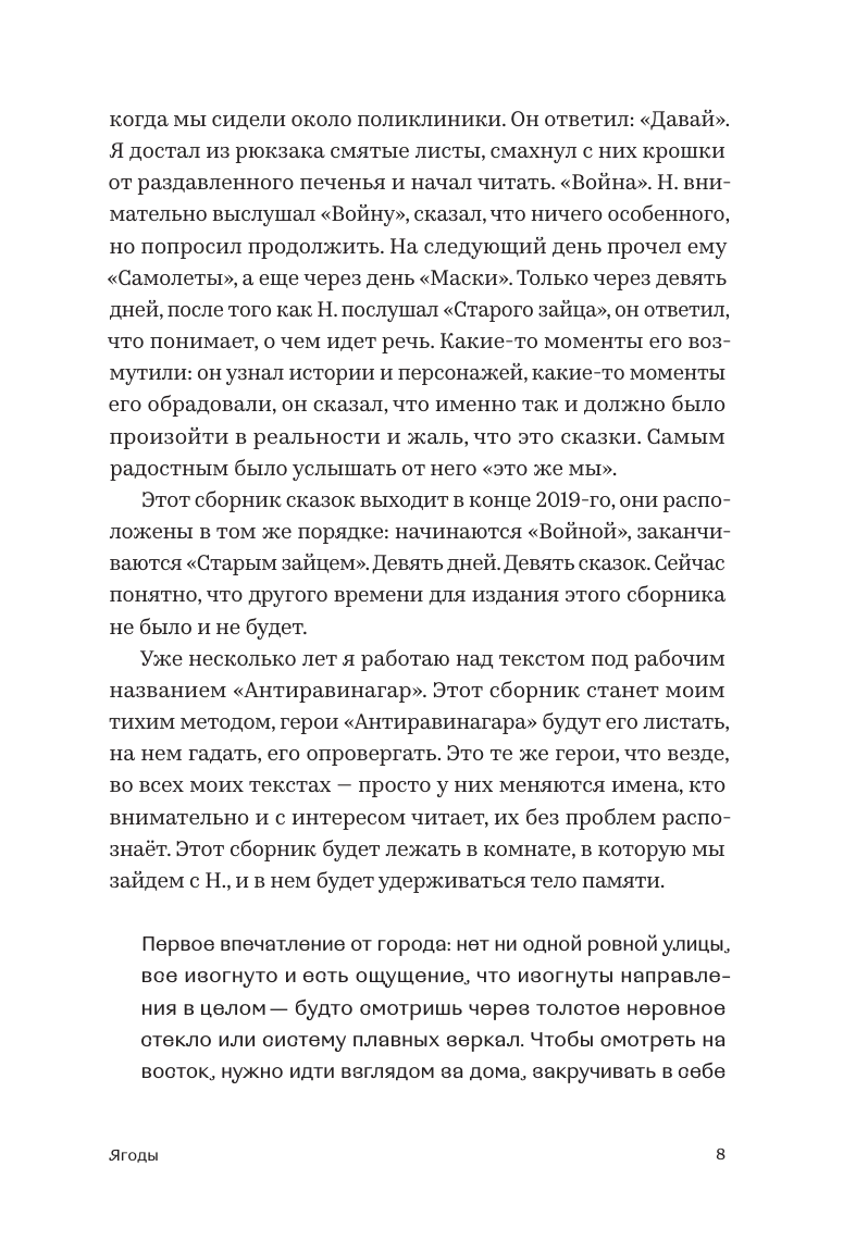 "Ягоды" - сборник магических сказок, написанных в разные годы. Отдельные тексты ложились в основу фильмов и спектаклей, но собранные вместе они образуют единый мир со сквозными сюжетами (уход от мира, волшебное превращение, общение живых и мертвых, безумие как способ изменить реальность) и перетекающими персонажами.