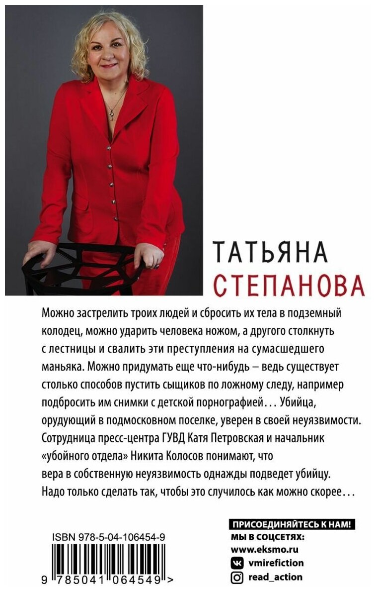 Можно застрелить троих людей и сбросить их тела в подземный колодец, можно ударить человека ножом, а другого столкнуть с лестницы и свалить эти преступления на сумасшедшего маньяка. Можно придумать еще что-нибудь – ведь существует столько способов пустить сыщиков по ложному следу, например, подбросить им снимки с детской порнографией… Убийца, орудующий в подмосковном поселке, уверен в своей неуязвимости. Сотрудница пресс-центра ГУВД Катя Петровская и начальник «убойного отдела» Никита Колосов понимают, что вера в собственную неуязвимость однажды подведет убийцу. Надо только сделать так, чтобы это случилось как можно скорее…