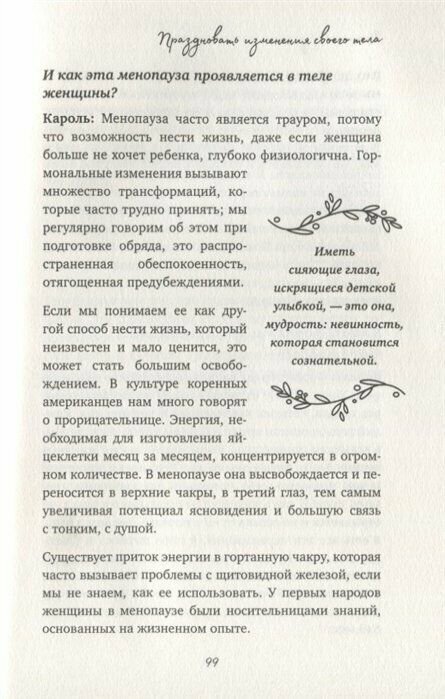 Книга Камилл Сфез обнимает, укутывает теплом, нашептывая о настоящем и ценном. Это как теплый разговор с мудрым наставником, который открывает перед тобой новые смыслы и развеивает страхи. Про страхи для меня была самая актуальная часть: как перестать бояться несовершенства, полюбить свои шрамы, снизить тревожность насчет беременности и родов, морщин и обвисших грудей. Для каждой женщины это сложная, больная тема, а автору этой книги удалось успокоить меня и помочь взглянуть на себя и свое тело иначе. Искренне рекомендую книгу всем молодым женщинам.