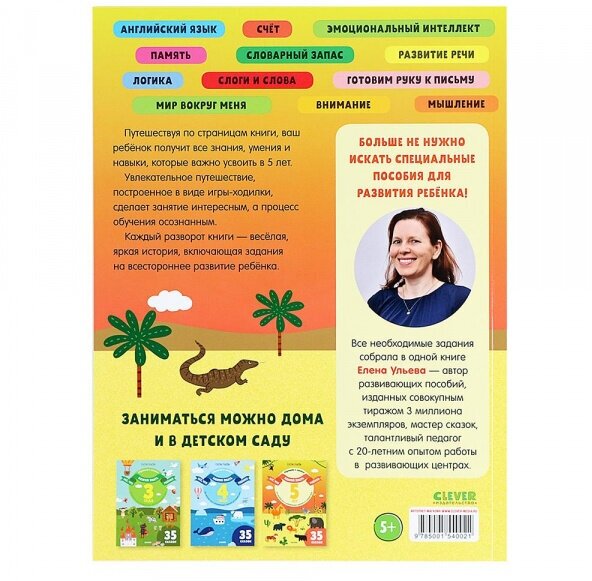 Путешествуя по страницам книги, ваш ребенок получит все знания, мения и навыки, которые важно усвоить в 5 лет. Увлекательное путешествие, построенное в виде игры-ходилки, сделает занятие интересным, а процесс обучения осознанным. Каждый разворот книги - веселая, яркаяистория, включающая задания на всестороннее развитие ребенка.