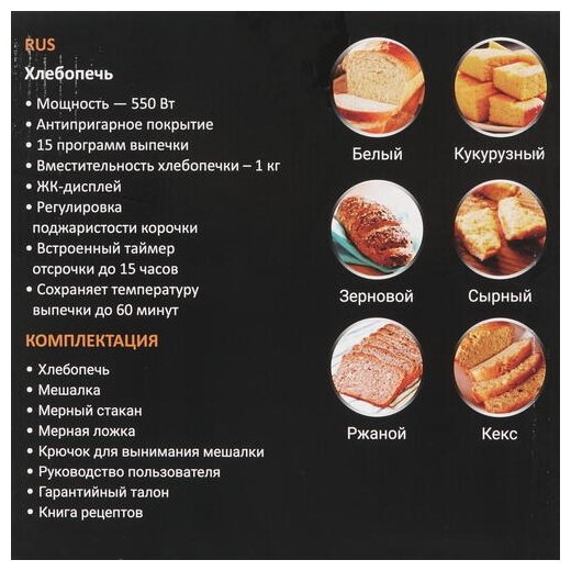 | Рецепты и программы | безглютеновая выпечка, белый хлеб, десертная выпечка, замес теста, йогурт, кекс, ускоренная выпечка из готовой смеси, французский хлеб, цельнозерновой хлеб |