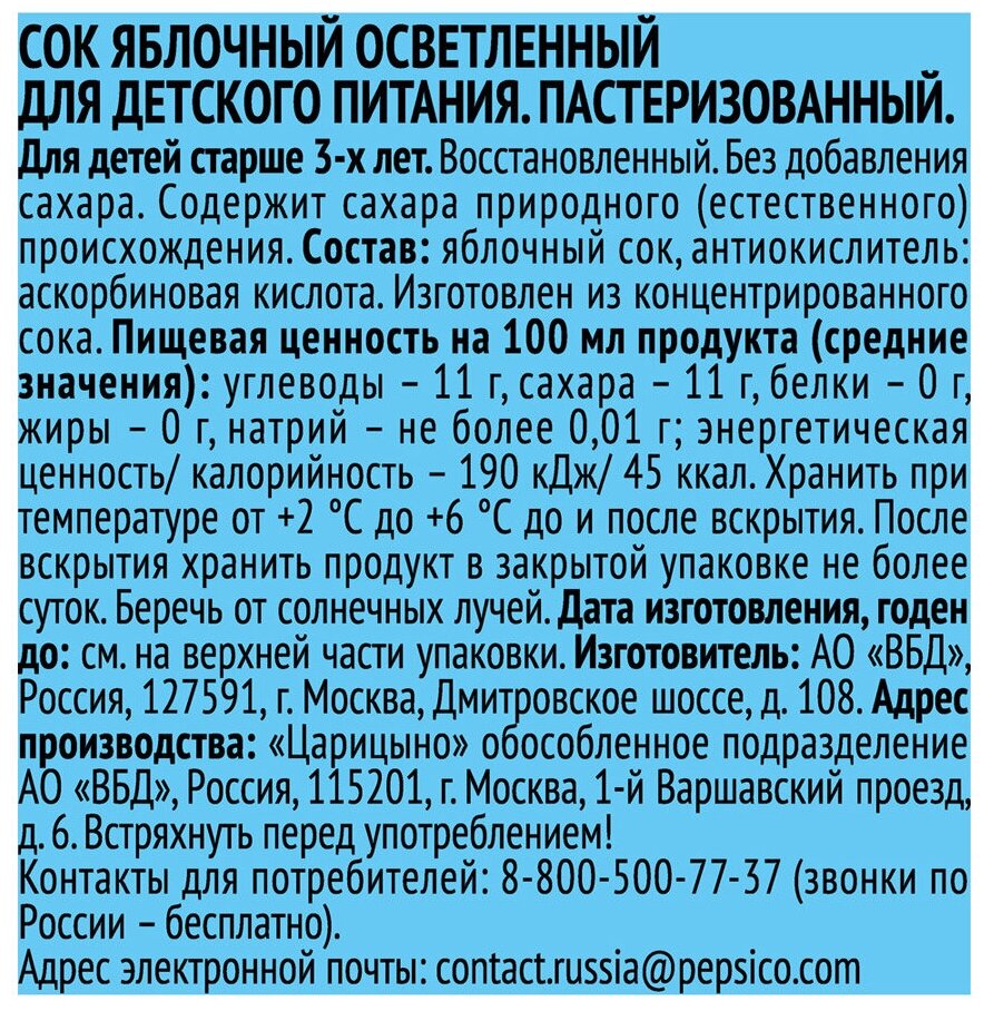 | Состав | Яблочный сок, антиокислитель: аскорбиновая кислота. |