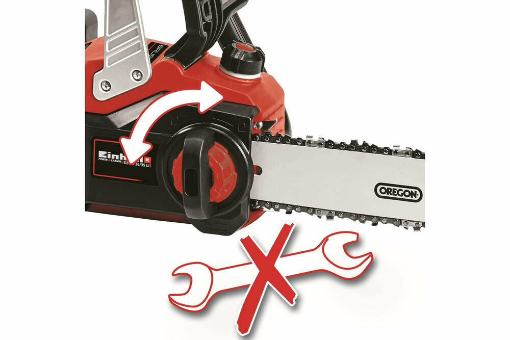 Цепная пила Einhell GE-LC 36/35 Li-Solo имеет высококачественную шину и цепь фирмы Oregon (USA). Инструмент поставляется без аккумулятора и зарядного устройства, но он может быть приведен в действие с помощью Power X-Change аккумулятора.