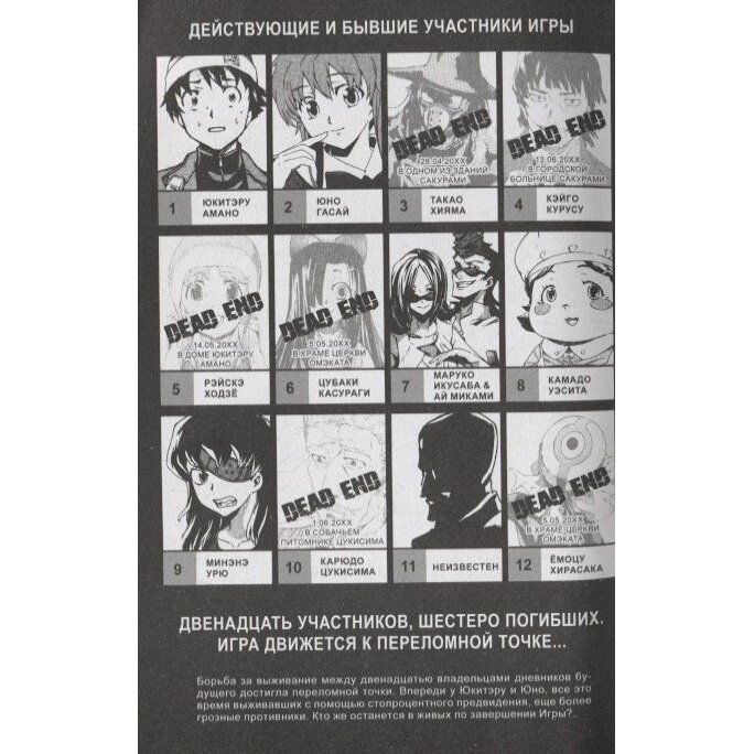У ничем не примечательного ученика средней школы Юкитэру Амано есть одно хобби - он ведет в своем телефоне дневник, куда записывает все, что происходит вокруг. Однажды утром он обнаруживает в нем записи из будущего. Поначалу Юкитэру не нарадуется открывшимся перед ним перспективам, но в один прекрасный день он натыкается на описание собственной смерти. Как оказалось, Юкитэру, сам того не подозревая, стал одним из двенадцати владельцев дневников будущего - участников беспощадной игры на выживание, организованной всемогущим повелителем времени и пространства. Удастся ли ему пройти игру? И может ли он довериться странной однокласснице Юно, заявившей, что они с ним обречены быть вместе?