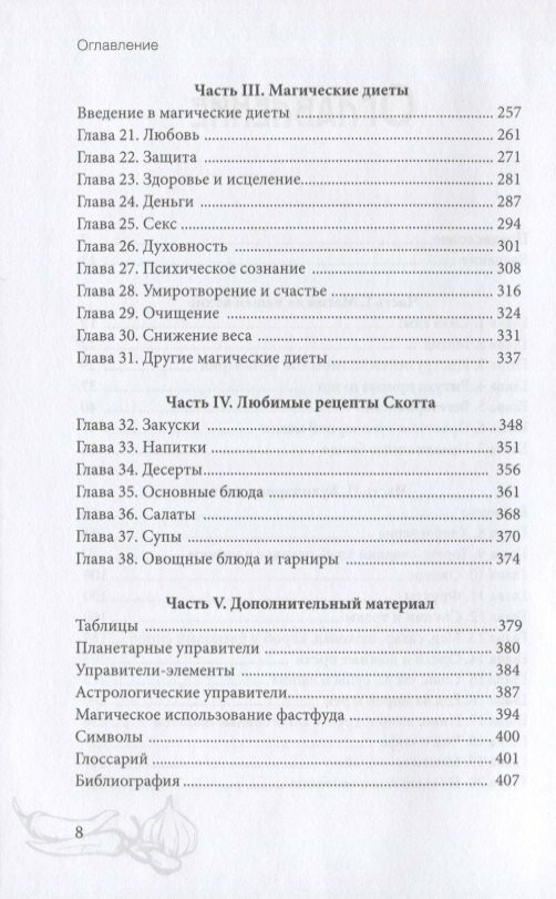 Вторая часть - энциклопедия магических продуктов. В каждой главе в сжатой форме описаны свойства и ритуальное использование сотен продуктов питания - от хлеба, моркови и грибов до шоколада и артишоков. К каждому продукту приводятся астрологические соответствия, народные предания и примеры магического применения.