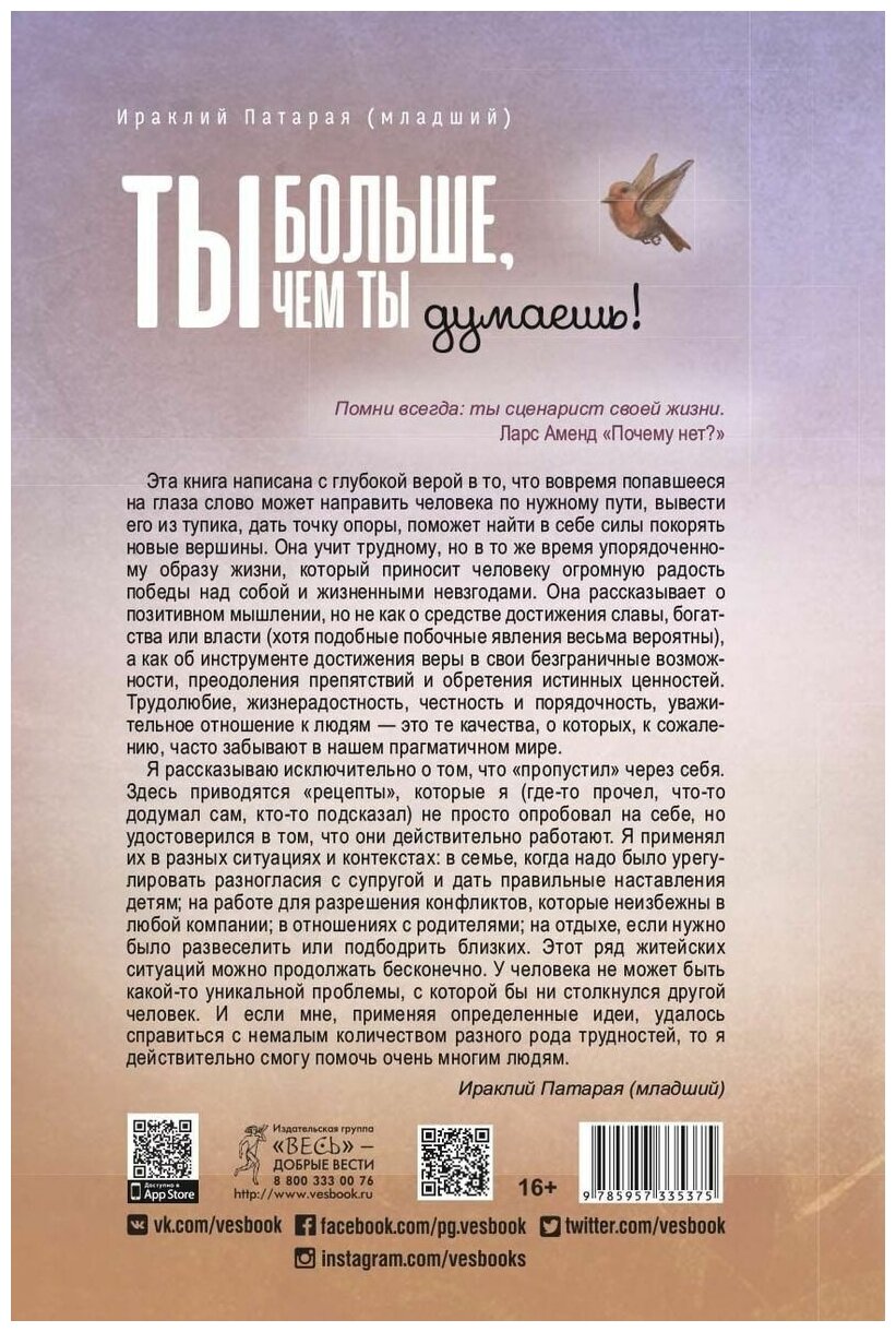 На сегодняшний день товар «Книга: Ты больше чем ты думаешь! (3537) (Патарая-младший Ираклий); Весь, 2019» можно купить с кешбеком в 3 магазинах: book24, Буквоед, Читай-город