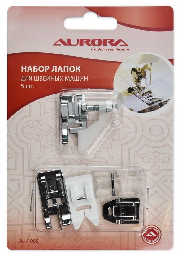 В набор Aurora входят: Лапка для потайной строчки Лапка для обметывания, оверлочная Лапка для потайной молнии Лапка для сатиновых строчек Лапка тефлоновая Все лапки, входящие в набор, подходят для большинства современных бытовых швейных машин. Производитель: Aurora Страна производства: Тайвань Лапки для большинства современных БШМ Универсальные 5/7 мм Артикул