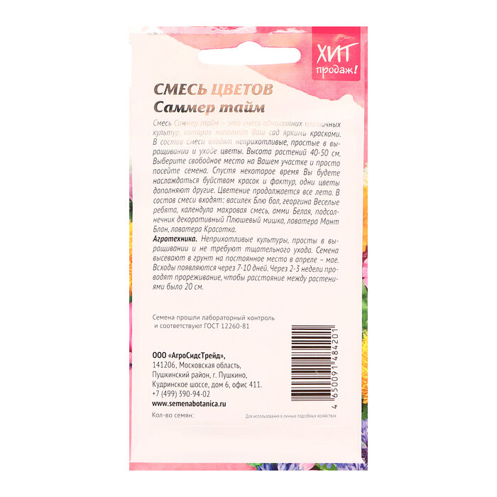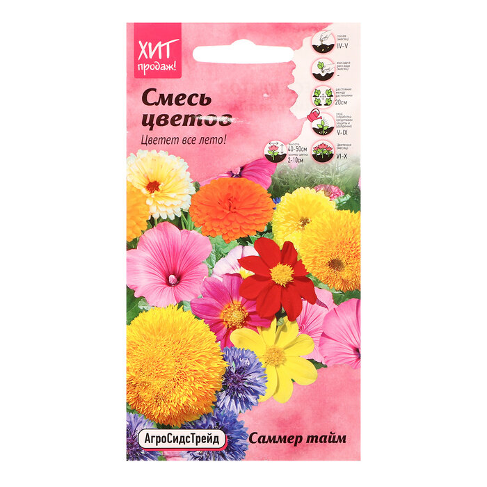 Смесь Саммер тайм - это смесь однолетних цветочных культур, которая наполнит Ваш сад яркими красками. В состав смеси входят неприхотливые, простые в выращивании и уходе цветы. Высота растений 40-50 см. Выберите свободное место на Вашем участке и просто посейте семена. Спустя некоторое время Вы будете наслаждаться буйством красок и фактур, одни цветы дополняют другие. Цветение продолжается все лето. В состав смеси входят: василек Блю бол, георгина Веселые ребята, календула махровая смесь, амми Белая, подсолнечник декоративный Плюшевый мишка, лаватера Монт Блан, лаватера Красотка.