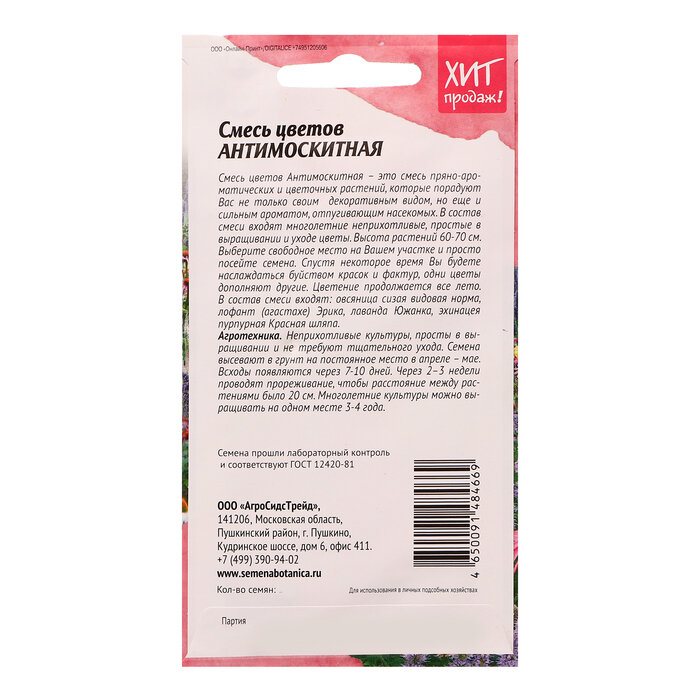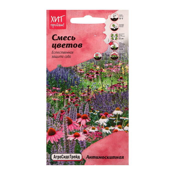 Смесь цветов Антимоскитная - это смесь пряно-ароматических и цветочных растений, которые порадуют Вас не только своим декоративным видом, но еще и сильным ароматом, отпугивающим насекомых. В состав смеси входят многолетние, неприхотливые, простые в выращивании и уходе цветы. Высота растений 60-70 см. Выберите свободное место на Вашем участке и просто посейте семена. Спустя некоторое время Вы будете наслаждаться буйством красок и фактур, одни цветы дополняют другие. Цветение продолжается все лето. В состав смеси входят: овсяница сизая видовая норма, лофант (агастахе) Эрика, лаванда Южанка, эхинацея пурпурная Красная шляпа.
