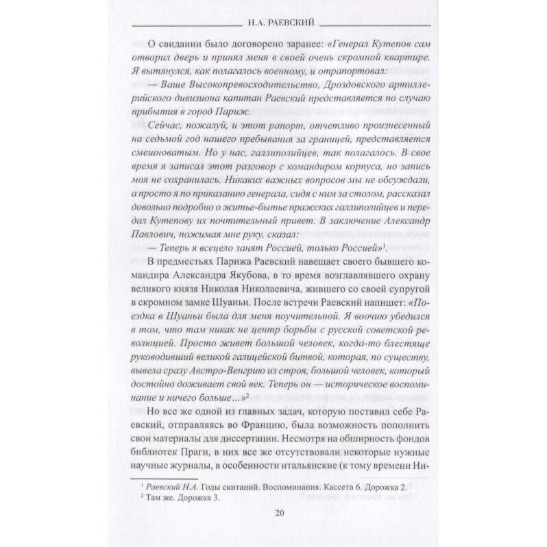 Николай Алексеевич Раевский (1894-1988) родился в семье дворян средней руки — и по происхождению, и по средствам. Еще в детстве выбрал себе дело на всю жизнь, правда, совсем не дворянское — насекомые (хотя можно вспомнить В.В. Набокова с его бабочками…). Кончив столичный университет, стал заниматься любимой наукой, но в 1915 г. побеждает чувство долга и Раевский уходит, после окончания краткосрочных курсов, прапорщиком в артиллерию. Провел два года на фронте, войну закончил в Румынии, поручиком, командиром батареи горных орудий. Революцию встретил было восторженно, но быстро пришло отрезвление. Вернувшись к семье, проживавшей на Полтавщине, весной 18 г. вступает в местный добровольческий отряд (как он пишет, «был русским офицером под украинским флагом»). Много пишет о своих и своих товарищей чувствах в отношении службы сначала под властью Центральной Рады, потом при Скоропадском, совместной работе с немцами. Не считает это грехом, но объясняет желанием на деле бороться с большевиками, при которых успел пожить, и неверием в успех белых.