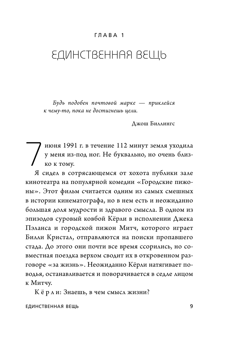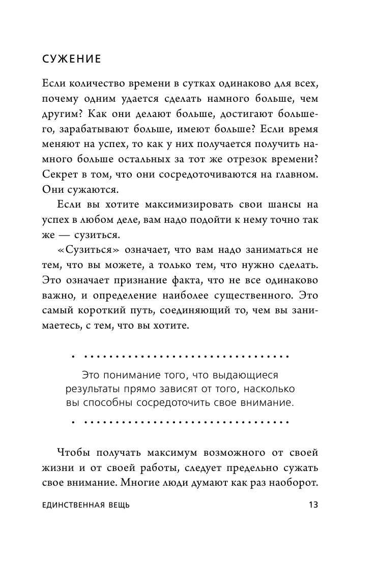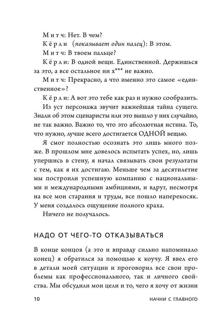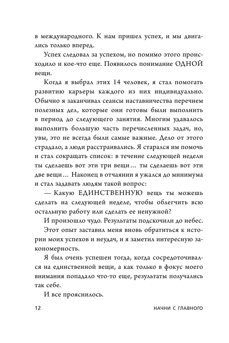 В основе предлагаемой в ней методики лежит простой принцип - на каждом временном отрезке, в каждом проекте, в каждой из жизненных сфер, нужно сосредоточить свое внимание только на одной задаче. На первый взгляд, этот подход кажется утопией, но если проанализировать истории по-настоящему успешных или даже выдающихся людей, станет ясно: все они действовали точно так же - фокусировали внимание на одной вещи и добивались феноменальных результатов. Автор "Начни с главного!" - Гери Келлер, владелец крупнейшего в Америке холдинга по торговле недвижимостью - подробно рассказывает, как следуя этому принципу, не выпустить из-под контроля остальные процессы и поднять свою продуктивность до нечеловеческих высот.