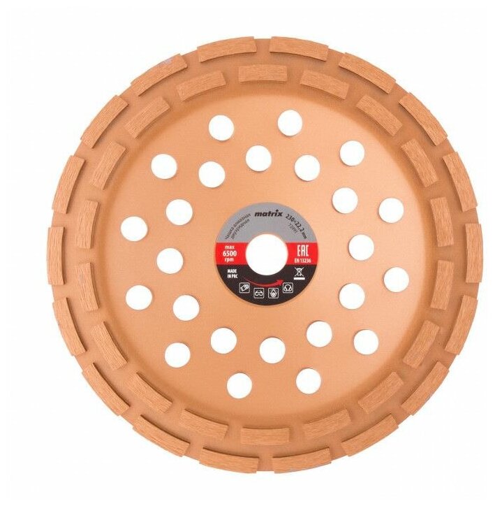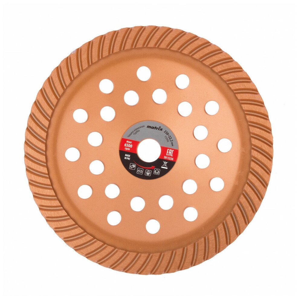 Алмазная зачистная чашка Matrix Turbo диаметром 230 мм устанавливается на вал углошлифовальной машины, для чего предусмотрено посадочное отверстие 22,2 мм. Используется для придания окончательной гладкости бетонным, каменным, мраморным, гранитным и кирпичным поверхностям, а также для снятия фаски на плитах из гранита или мрамора. Предназначена для профессионального применения.Преимущества Высокий ресурс — рабочий слой толщиной 6 мм характеризуется увеличенной плотностью алмазов и сбалансированной связкой Работа без подачи воды — турбированная поверхность обеспечивает достаточное охлаждение Быстрая и плавная шлифовка — чашка имеет увеличенную площадь соприкосновения с обрабатываемой поверхностью Эффективность и долгий срок службы — в корпусе предусмотрены отверстия для отвода шлама и тепла Устойчивость к воздействию влаги — стальной корпус покрыт эмалью для защиты от коррозии Гарантированное качество — чашка произведена на специализированном заводе с соблюдением всех технологический требований
