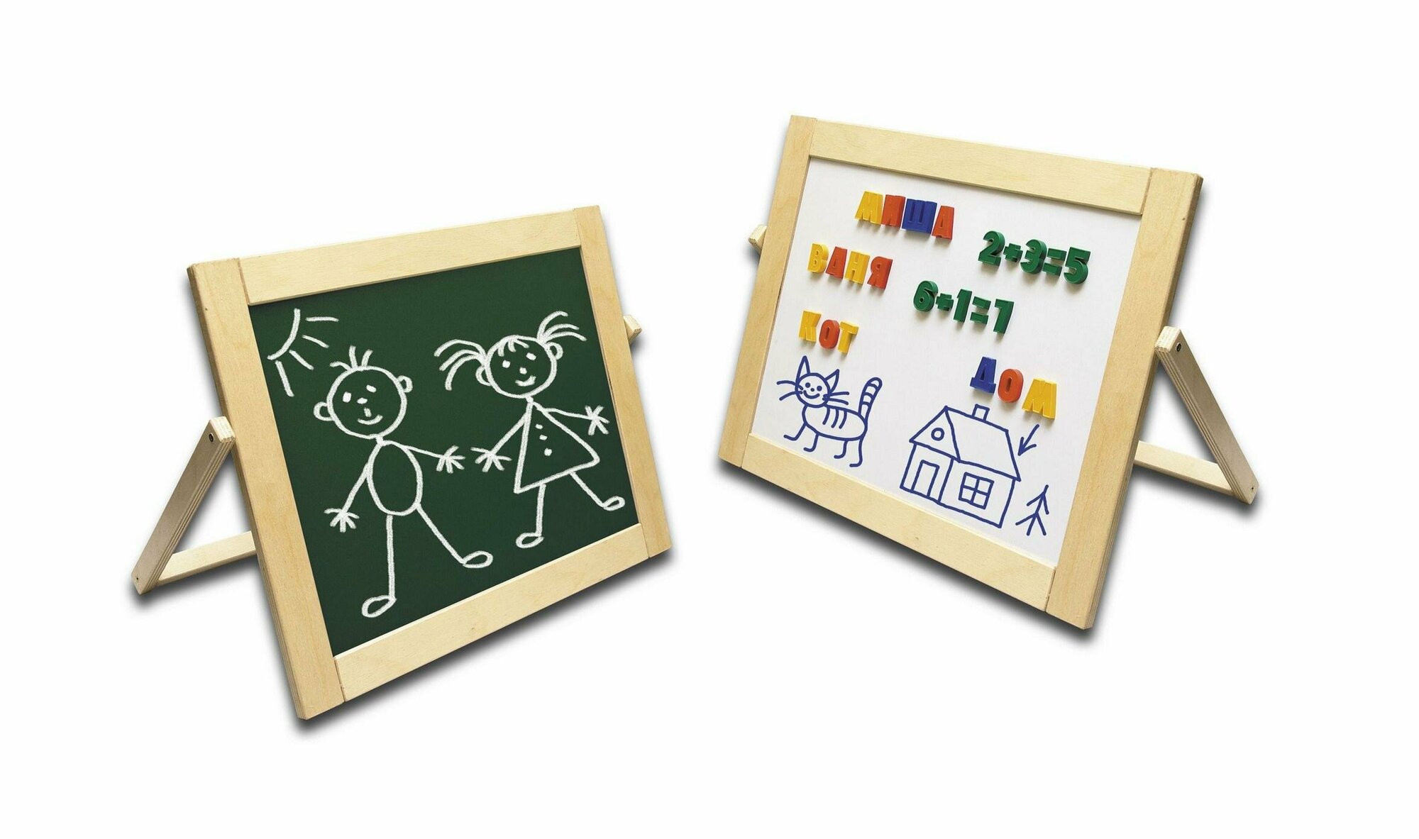 Практично задействованы обе стороны данной модели: зеленая сторона - для рисования мелом, белая - для рисования маркером и составления слов из магнитной азбуки. Как учебное пособие пригодится воспитателям детских дошкольных учреждений для занятий с малышами: поможет подготовить их к школе, а также просто для игр и развития творческих навыков.