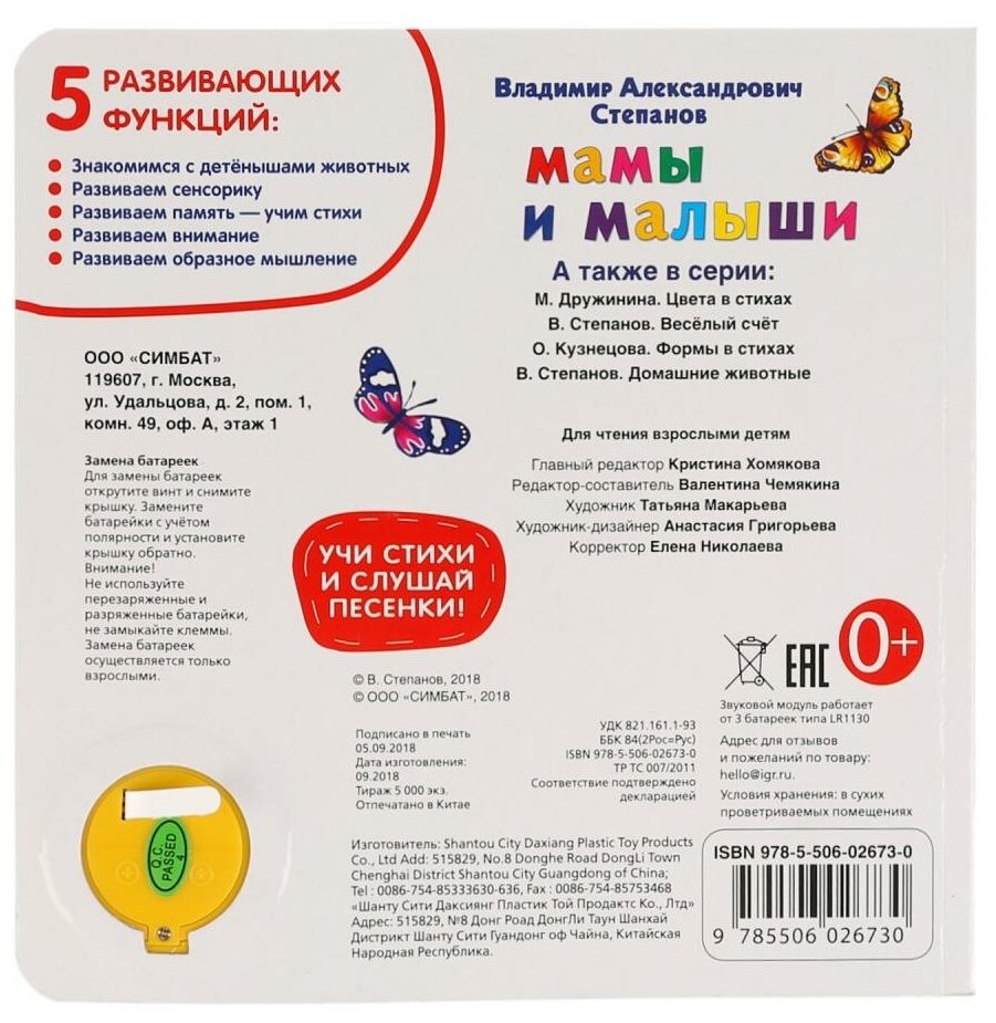 "Умка". Мамы и малыши. В.Степанов (1 кн. 3 песенки. Методика ран. обучения). 180х180мм в кор.24шт 9785506026730