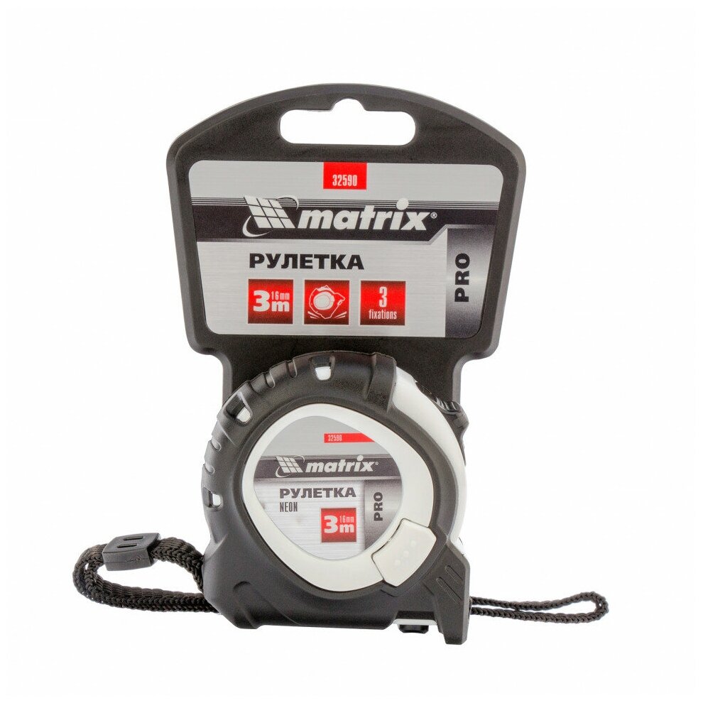 Рулетка Neon 3 м x 16 мм MATRIX обрезиненный корпус 3 фиксации 32590