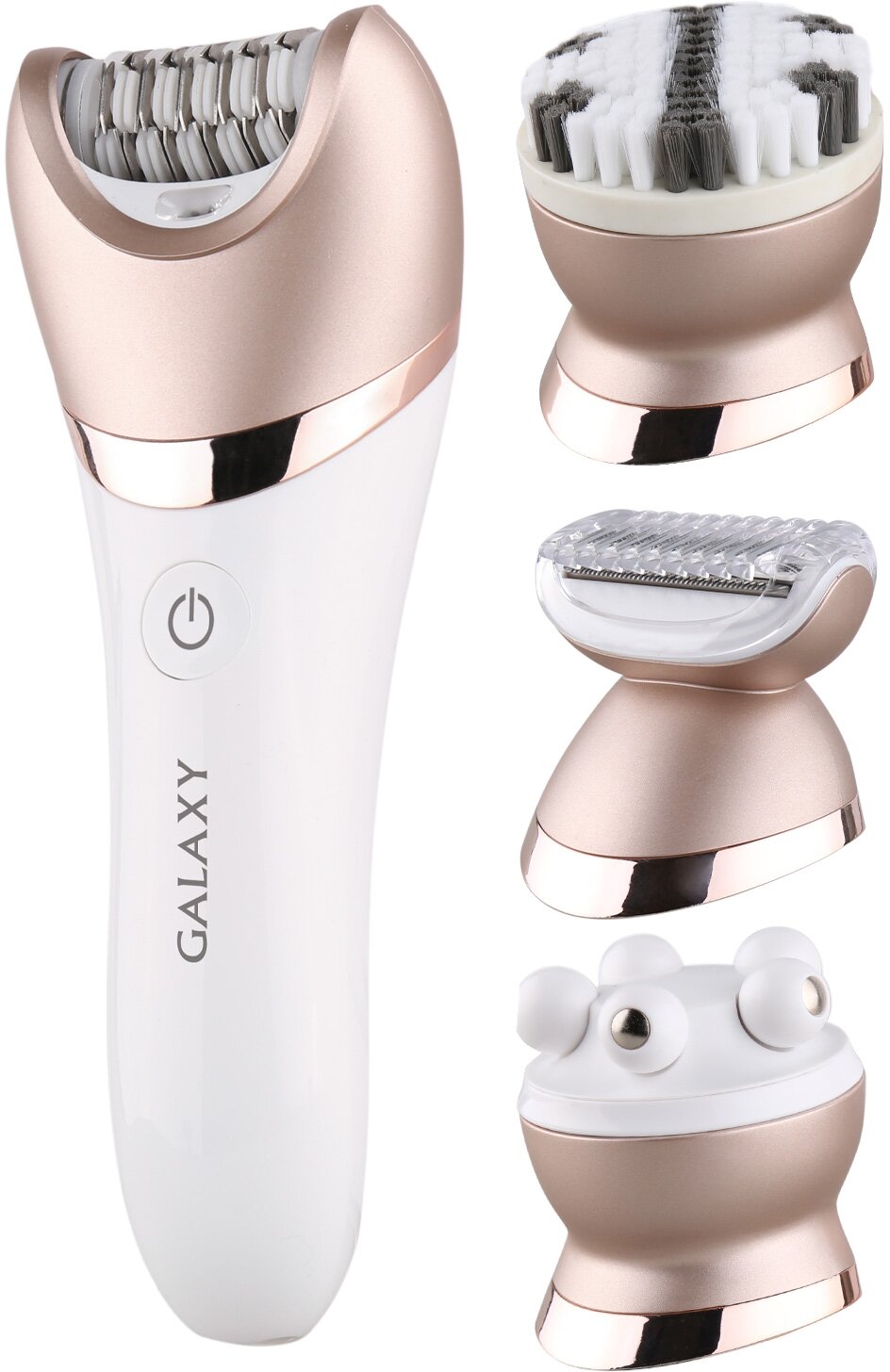 Galaxy — это универсальный прибор для ухода за телом и лицом. С его помощью можно осуществить эпиляцию, пилинг и массаж. Модель выполнена в водонепроницаемом корпусе, поэтому ее можно использовать в ванной и душе. Насадка-бритва и насадка для депиляции обеспечивает бережное бритье различных участков кожи. Массажная насадка успокаивает кожу после бритья, улучшает кровообращение, постепенно избавляет от целлюлита. В комплекте также присутствует насадка для пилинга лица. С ее помощью вы удалите остатки макияжа, избавитесь от загрязнения и ороговевших клеток кожи.