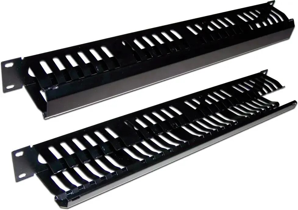 Металлический кабельный органайзер повышенной вместимости выпускается высотой 1U или 2U. предназначен для укладки избытка длины коммутационных шнуров, что позволяет упорядочить размещение шнуров, избежать образования петель, а также обеспечить хорошую видимость элементов маркировки. Имеет по 24 выреза с каждой из сторон для введения патч-кордов. Форма стенок специально разработана для совпадения портов патч-панелей и прорезей отводимых шнуров при укладке. В задней стенке кабельного органайзера имеется три отверстия для подводки коммутационных шнуров с тыльной стороны. Наличие металлической крышки позволяет скрыть коммутационные шнуры и сохранить эстетичный внешний вид поля коммутации.