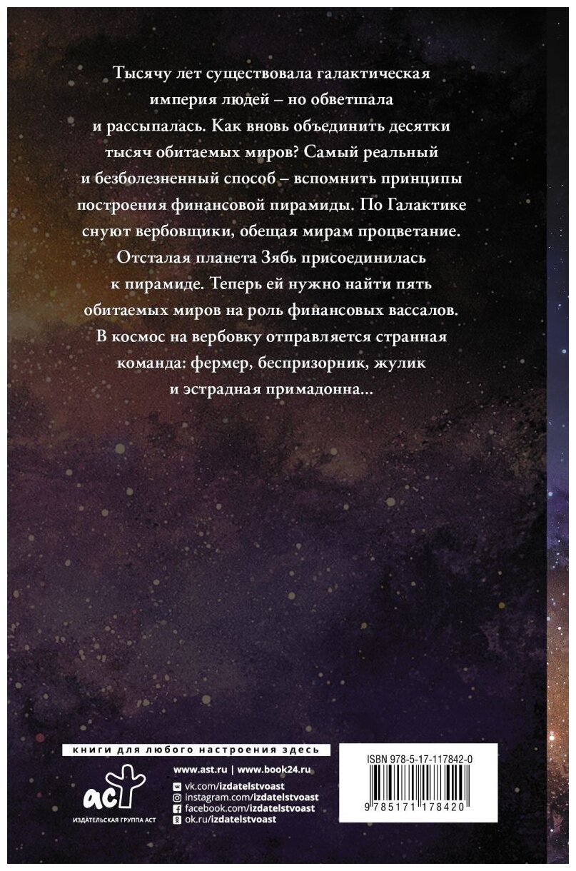 Тысячу лет существовала галактическая империя людей - но обветшала и рассыпалась. Как вновь объединить десятки тысяч обитаемых миров? Самый реальный и безболезненный способ - вспомнить принципы построения финансовой пирамиды. По Галактике снуют вербовщики, обещая мирам процветание. Отсталая планета Зябь присоединилась к пирамиде. Теперь ей нужно найти пять обитаемых миров на роль финансовых вассалов. В космос на вербовку отправляется странная команда: фермер, беспризорник, жулик и эстрадная примадонна...