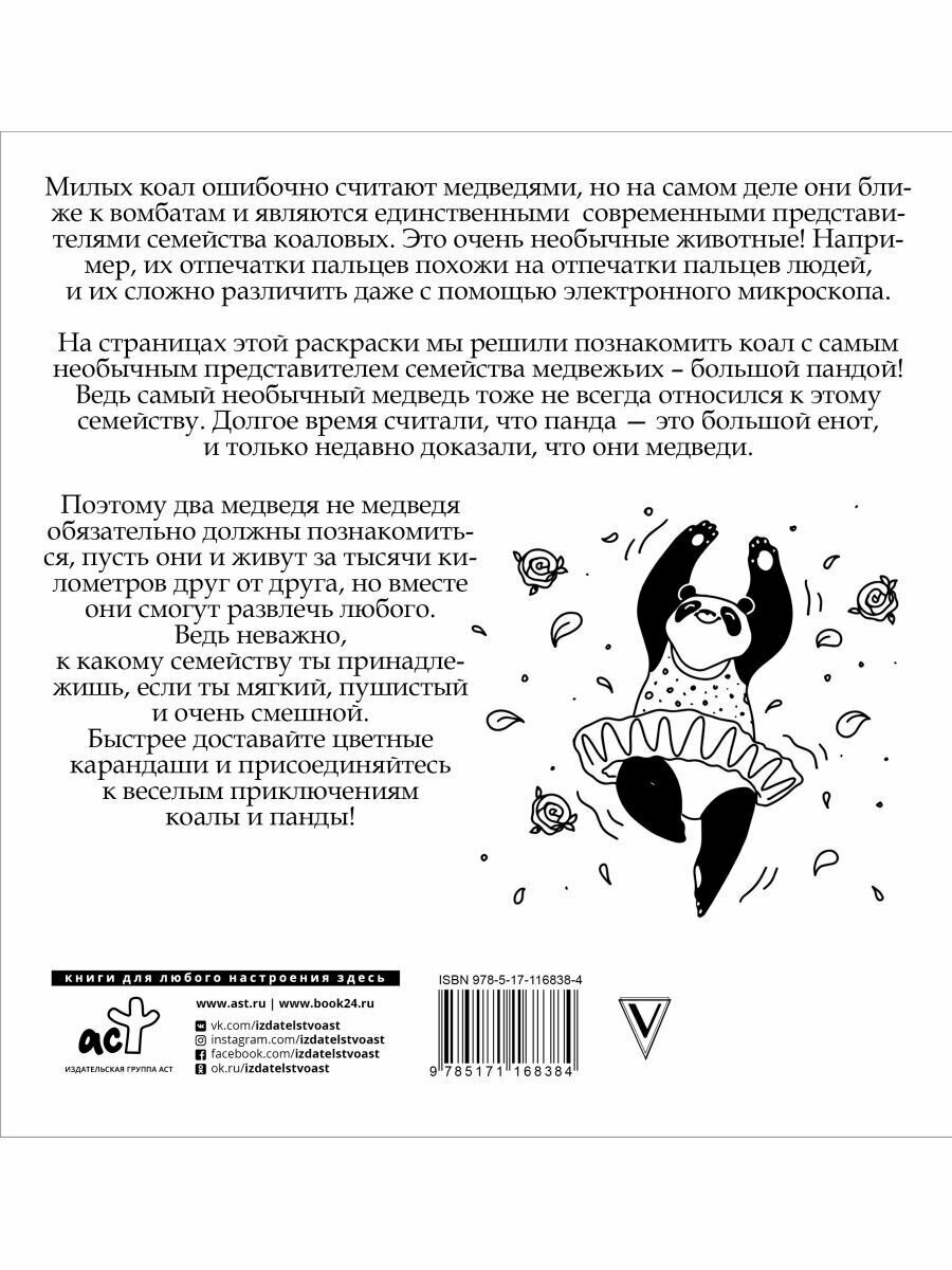 Милых коал ошибочно считают медведями, но на самом деле они ближе к вомбатам и являются единственными современными представителями семейства коаловых. Это очень необычные животные! Например, их отпечатки пальцев похожи на отпечатки пальцев людей, и их сложно различить даже с помощью электронного микроскопа. На страницах этой раскраски мы решили познакомить коал с самым необычным представителем семейства медвежьих – большой пандой! Ведь самый необычный медведь тоже не всегда относился к этому семейству. Долгое время считали, что панда — это большой енот, и только недавно доказали, что они медведи. Поэтому два медведя не медведя обязательно должны познакомиться, пусть они и живут за тысячи километров друг от друга, но вместе они смогут развлечь любого. Ведь неважно, к какому семейству ты принадлежишь, если ты мягкий, пушистый и очень смешной.