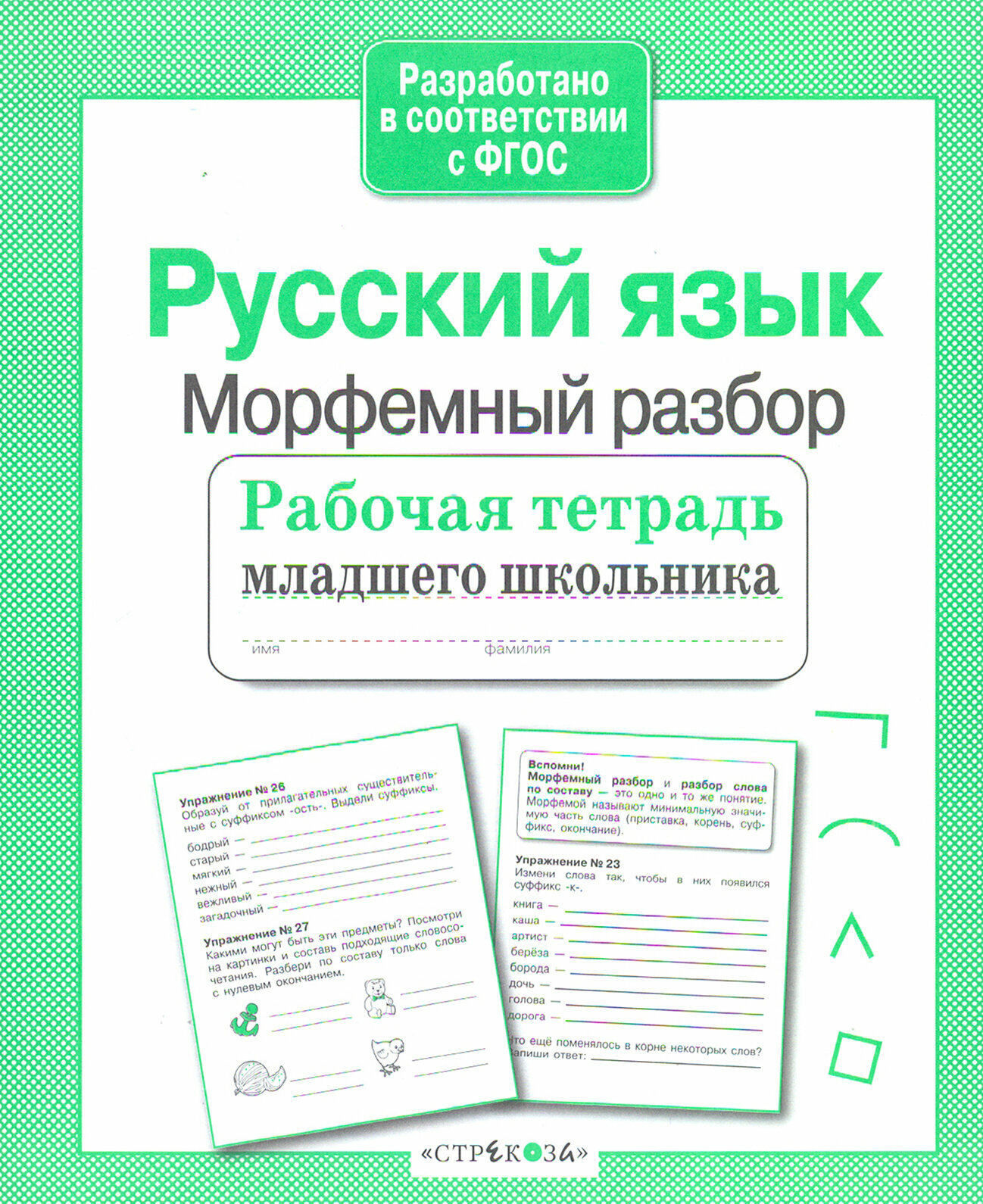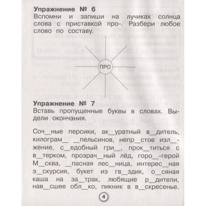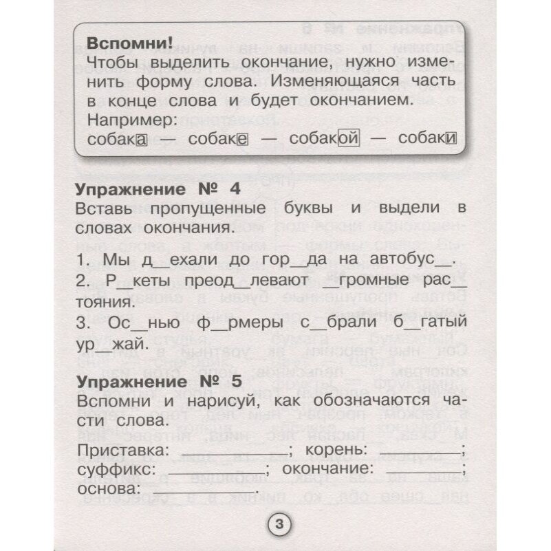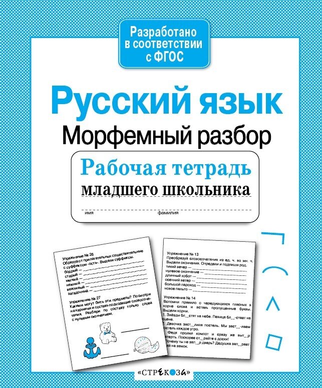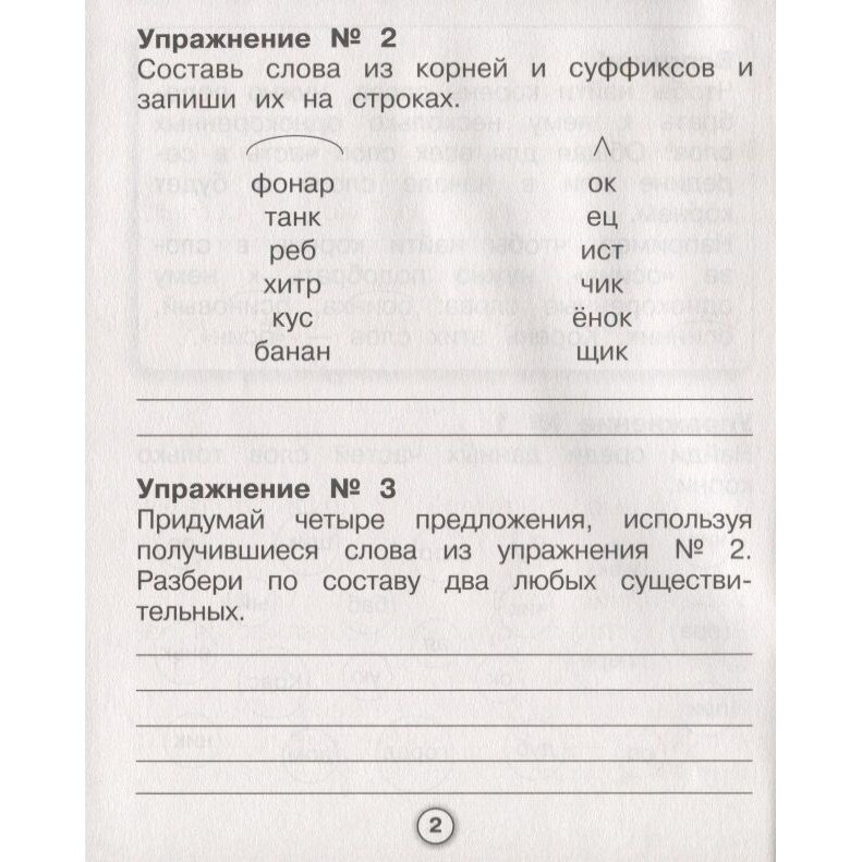 Тетрадь для морфемного разбора. А значит, надо приготовиться разбирать слова на корни, приставки, суффиксы и окончания, рисовать дуги, квадратики, галочки и т.д... Кроме ручки понадобятся цветные карандаши. Задания самые разные: вставить пропущенные буквы и целые слова, восстановить порядок слов в предложениях, а также на словообразование с помощью подсказок или каких-то определенных условий , и т.д... Рассматриваются и существительные, и прилагательные, и глаголы. Тетрадь такого же качества как и остальные в этой серии. Картинок почти нет, очень легкая, тонкая и удобная. Для ответов оставлены пропуски и специальные строчки.
