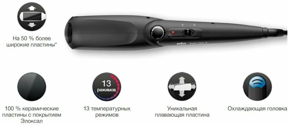 Стайлер для выпрямления волос Satin Hair 3 - очень широкие, полностью керамические пластины для быстрой и ультрагладкой укладки Стайлер для выпрямления волос Braun Satin Hair 3 с очень широкими пластинами обеспечивает эффективную укладку и максимально защищает волосы благодаря регулированию температуры и настоящим, на 100% керамическим плавающим пластинам.
