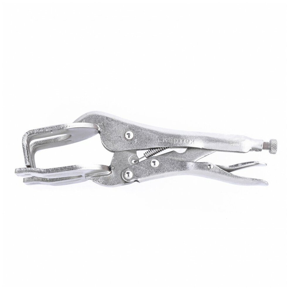 Ручной зажим с фиксатором предназначен для удержания и временной фиксации разнообразных по форме предметов. Для регулировки ширины захвата на корпусе установлен винт. Защитное покрытие инструмента никель.