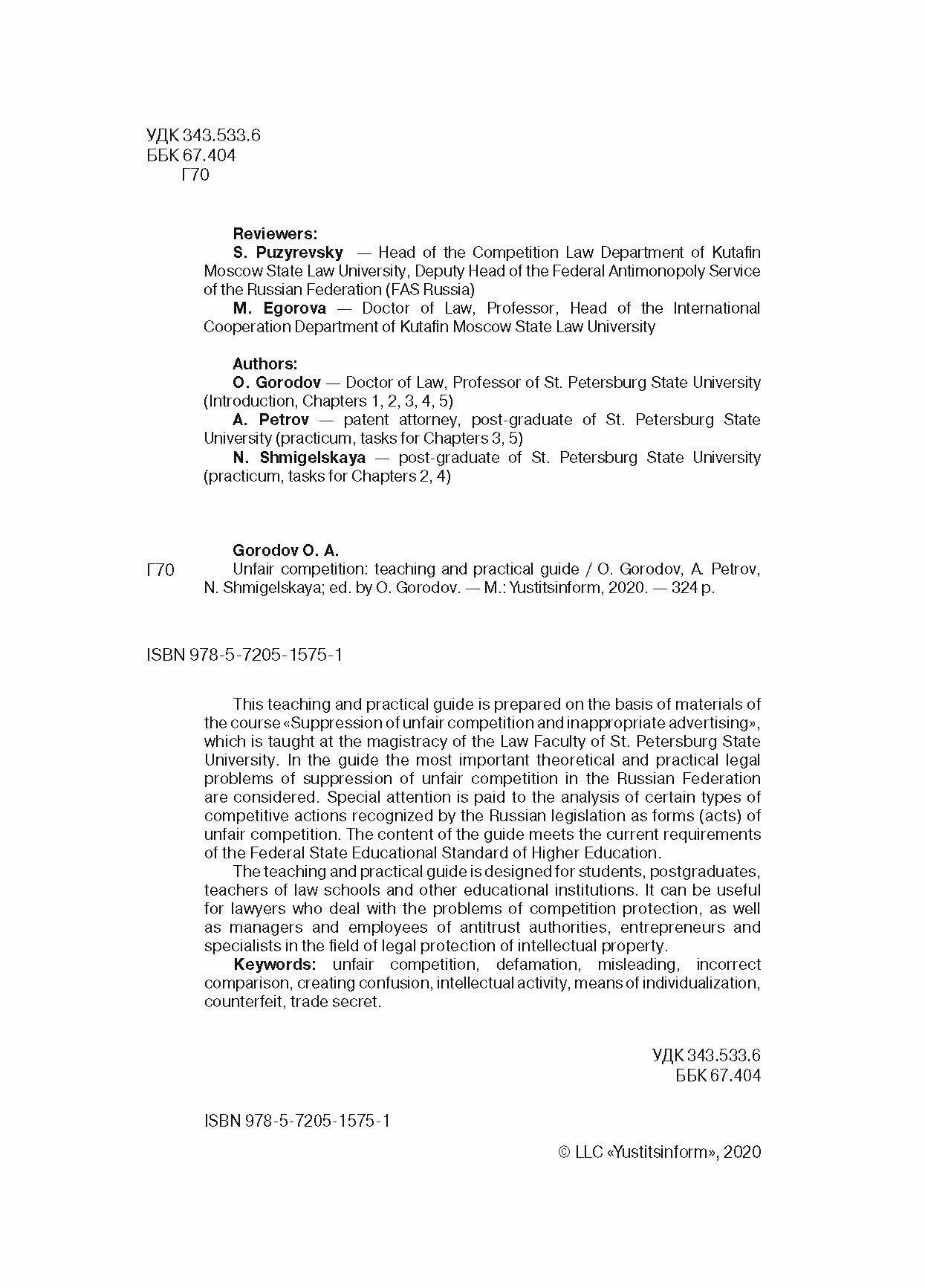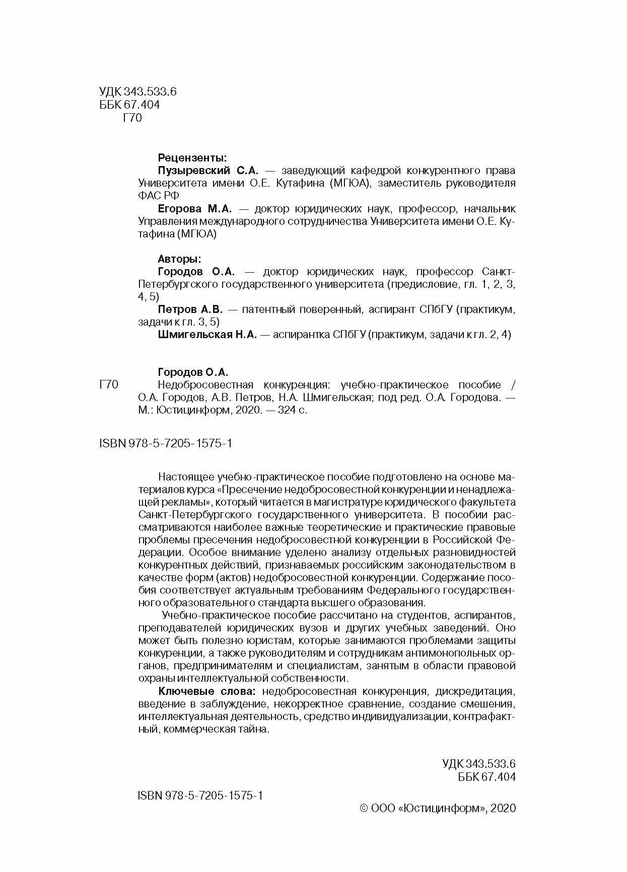 Недобросовестная конкуренция. Учебно-практическое пособие (Городов Олег Александрович, Петров А. В., Шмигельская Н. А.); Юстицинформ, 2020