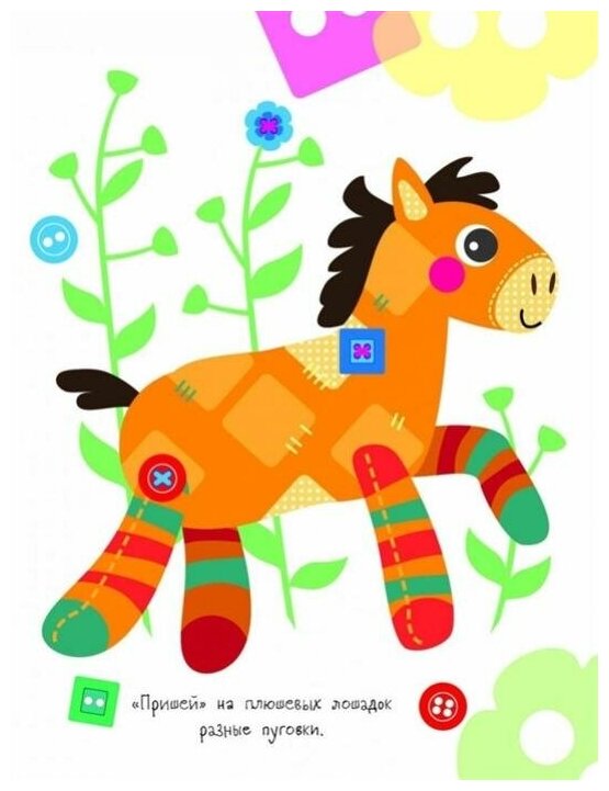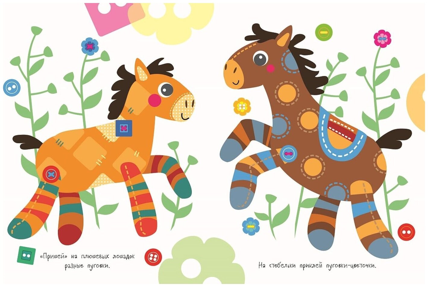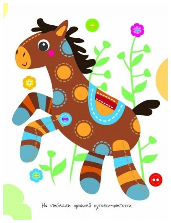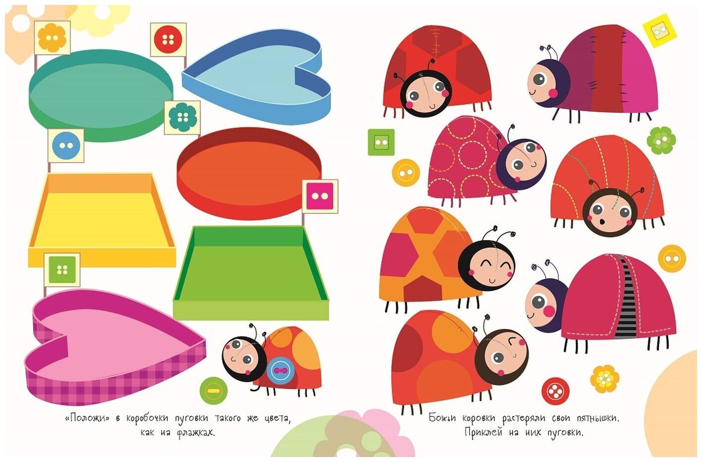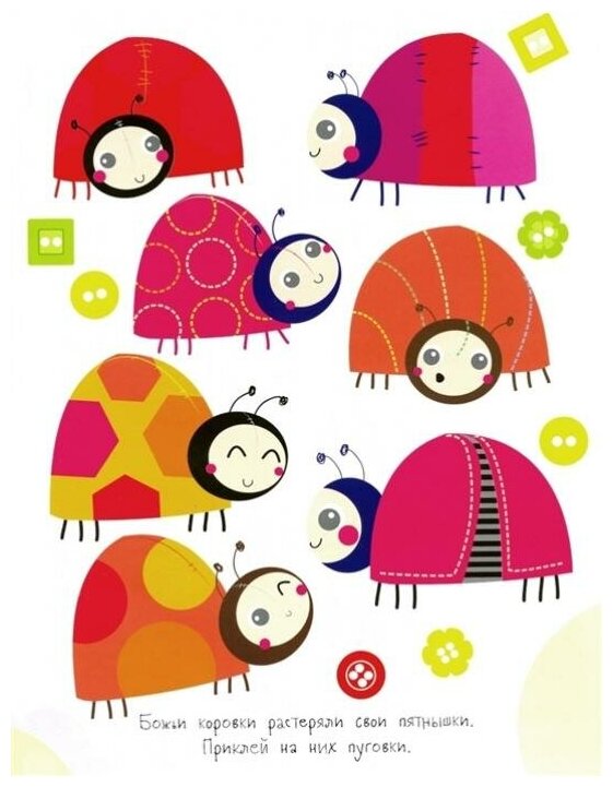 В этой книге вашего малыша ждёт необычная игра с наклейками. Каждую картинку нужно дополнить пуговками. Покажите малышу, что пуговки можно приклеивать в пунктирные кружочки, на петельки или в любые подходящие места. И конечно, пуговками можно украшать картинки! Если с первой попытки приклеить пуговку ровно не получилось - не беда, ведь наклейки многоразовые.