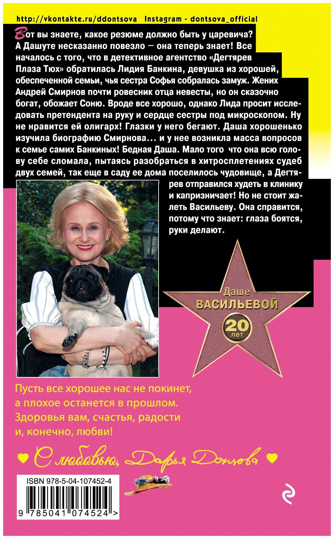 Вот вы знаете какое резюме должно быть у царевича? А Дашуте несказанно повезло - она теперь знает! Все началось с того, что в детективное агентство "Дегтярев Плаза Тюх" обратилась Лидия Банкина, девушка из хорошей, обеспеченной семьи, чья сестра Софья собралась замуж. Жених Андрей Смирнов почти ровесник отца невесты, но он сказочно богат, обожает Соню. Вроде все хорошо, однако Лида просит исследовать претендента на руку и сердце сестры под микроскопом. Ну не нравится ей олигарх! Глазки у него бегают. Даша хорошенько изучила биографию Смирнова и… у нее возникла масса вопросов к семье самих Банкиных!