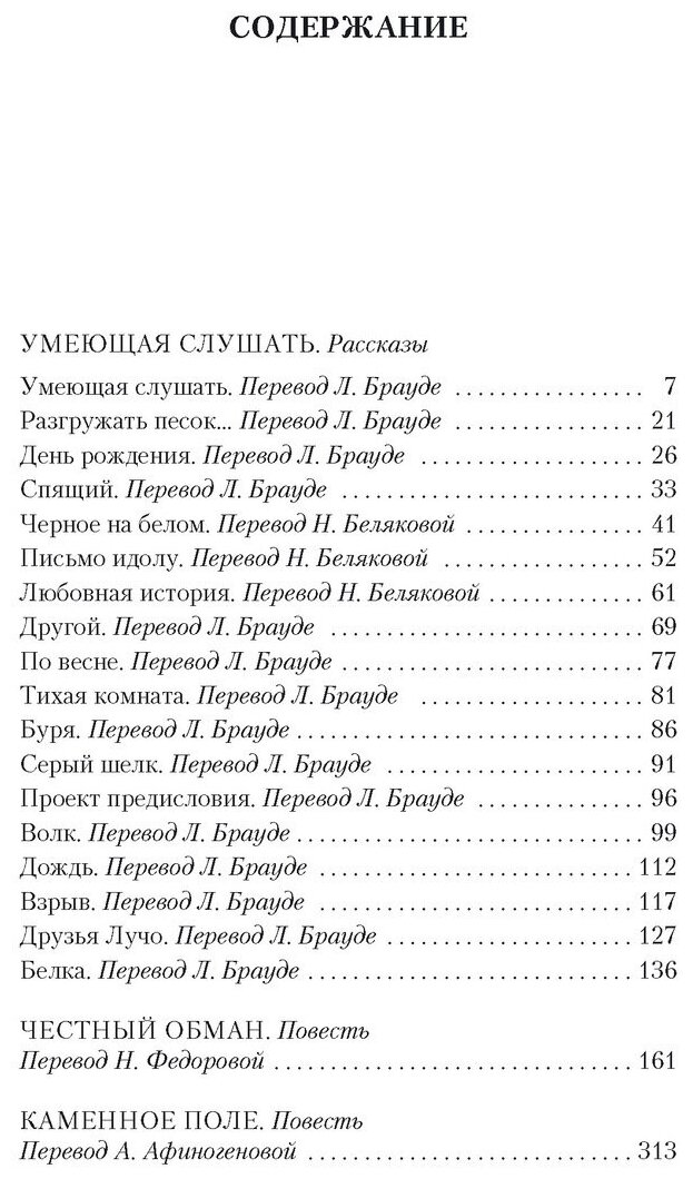Создательницу муми-троллей Туве Янссон по праву можно назвать одной из самых загадочных писательниц прошлого столетия. Лаконично и честно рассказывая о повседневном, Янссон словно составляла инструкцию своей жизни, не забывая наполнять произведения автобиографическими деталями. Она росла в творческой семье: ее мать была иллюстратором, а отец – скульптором. Сама Туве начала рисовать в пятнадцать лет и мечтала стать художником, а не писателем. Ей удалось и то и другое. В книгу вошли повести "Честный обман" (1982) и "Каменное поле" (1984), а также сборник коротких рассказов и миниатюр "Умеющая слушать" (1971).